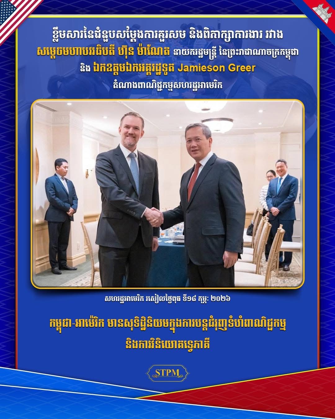 ភ្នំពេញ:នារសៀលថ្ងៃទី១៨ ខែកុម្ភៈ ឆ្នាំ២០២៦, សម្ដេចមហាបវរធិបតី ហ៊ុន ម៉ាណែត នាយករដ្ឋមន្ត្រី នៃព្រះរាជាណាចក្រកម្ពុជា បានជួបពិភាក្សាការងារជាមួយ ឯកឧត្ដមឯកអគ្គរដ្ឋទូត Jamieson Greer តំណាងពាណិជ្ជកម្មសហរដ្ឋអាម៉េរិក ក្នុងឱកាសនៃការដឹកនាំគណៈប្រតិភូរាជរដ្ឋាភិបាលកម្ពុជាចូលរួមកិច្ចប្រជុំលើកដំបូងនៃក្រុមប្រឹក្សាសន្តិភាព (Board of Peace) នៅរដ្ឋធានីវ៉ាស៊ីនតោន សហរដ្ឋអាម៉េរិក។