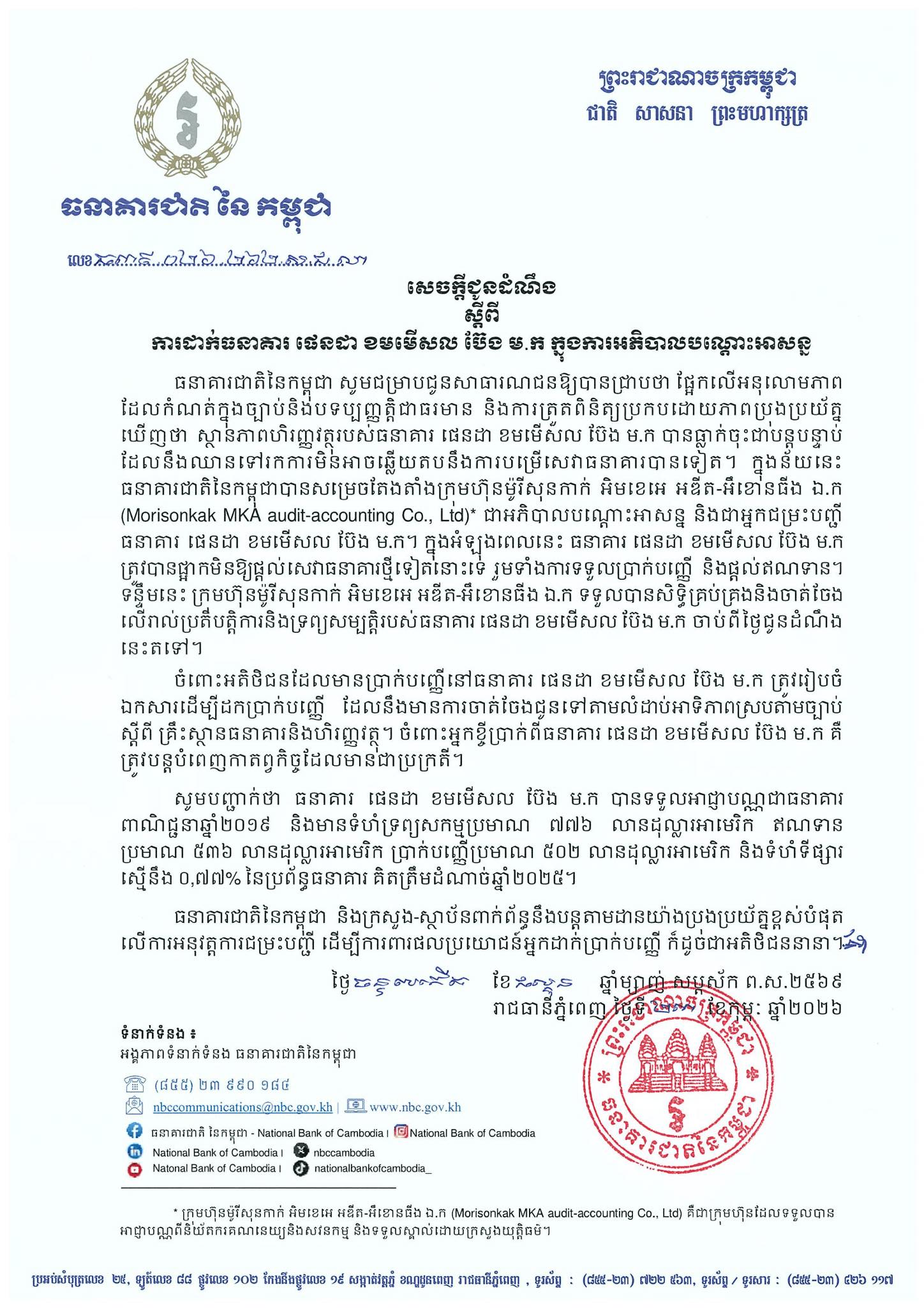 ភ្នំពេញ: នៅរសៀលថ្ងៃទី ២៣ ខែកុម្ភៈ ឆ្នាំ ២០២៦ នេះ ធនាគារជាតិ នៃកម្ពុជា បានចេញសេចក្តីជូនដំណឹង ស្តីពីការដាក់ធនាគារ ផេនដា ខមមើសល ប៊ែង ម.ក ក្នុងការអភិបាលបណ្តោះអាសន្ន។