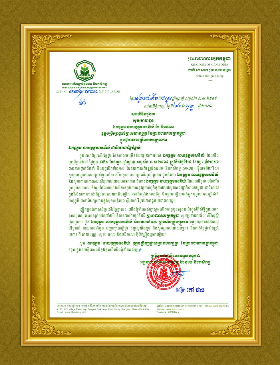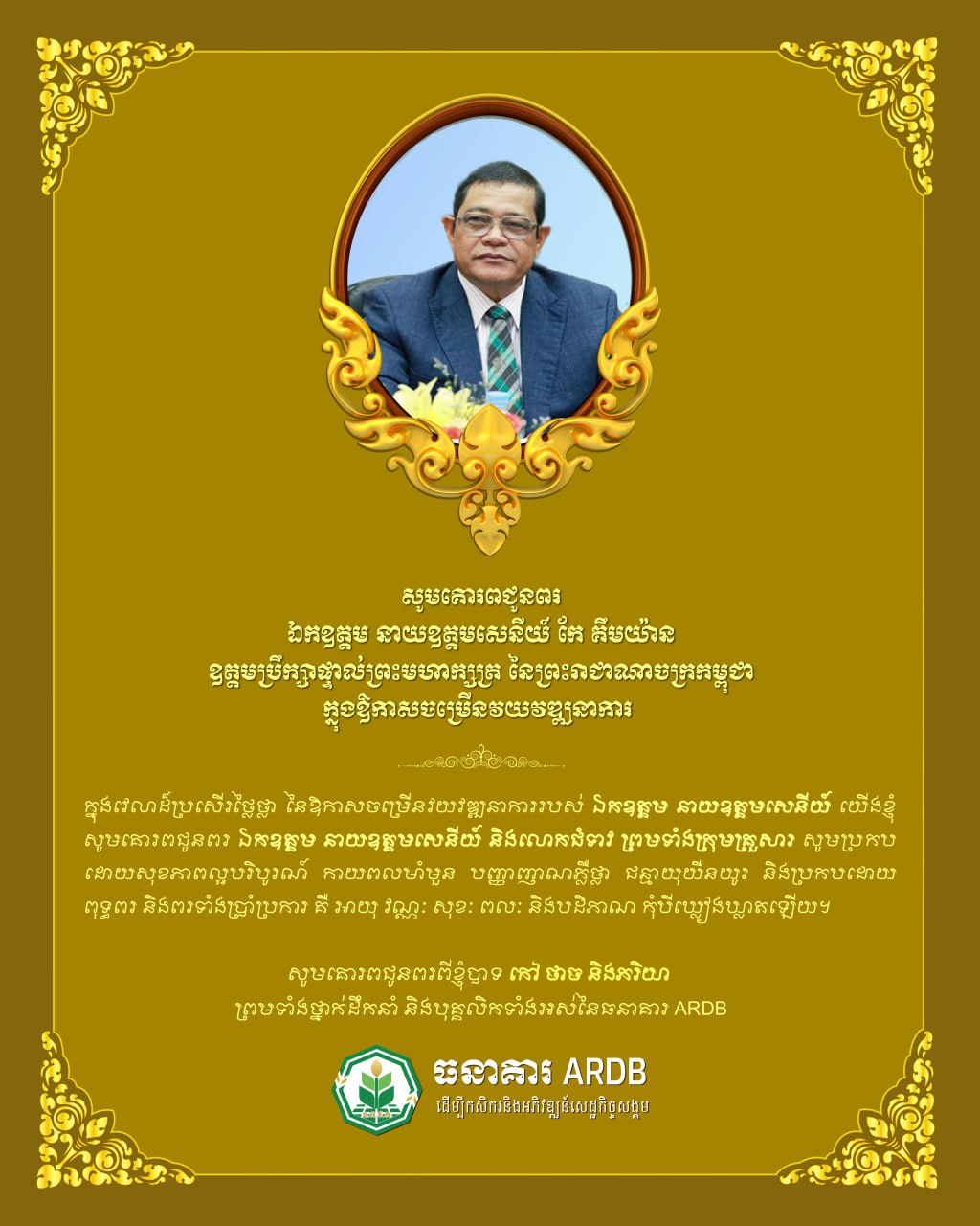 ភ្នំពេញ៖ ឯកឧត្តមបណ្ឌិត កៅ ថាច ប្រតិភូរាជរដ្ឋាភិបាល ទទួលបន្ទុកជាអគ្គនាយក ធនាគារអភិវឌ្ឍន៍ជនបទ និងកសិកម្ម និងលោកជំទាវ ថ្នាក់ដឹកនាំនៃធនាគារ ARDBនិងបុគ្គលិកទាំងអស់ សូមគោរពជូនឯកឧត្តម នាយឧត្តមសេនីយ៍ កែ គឹមយ៉ាន ឧត្តមប្រឹក្សាផ្ទាល់ព្រះមហាក្សត្រ នៃព្រះរាជាណាចក្រកម្ពុជា ក្នុងឱកាសចម្រើនវយវឌ្ឍនាការ។