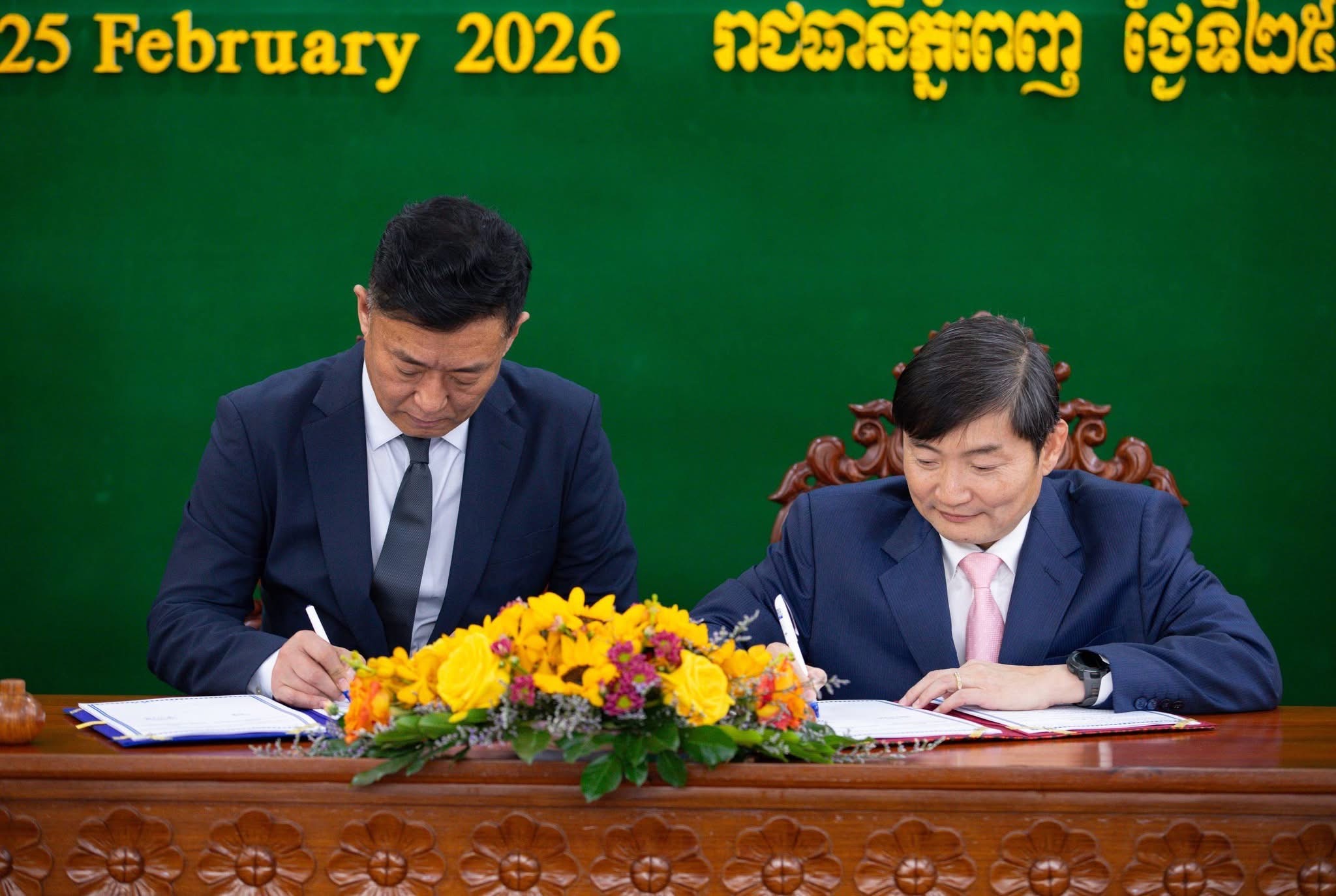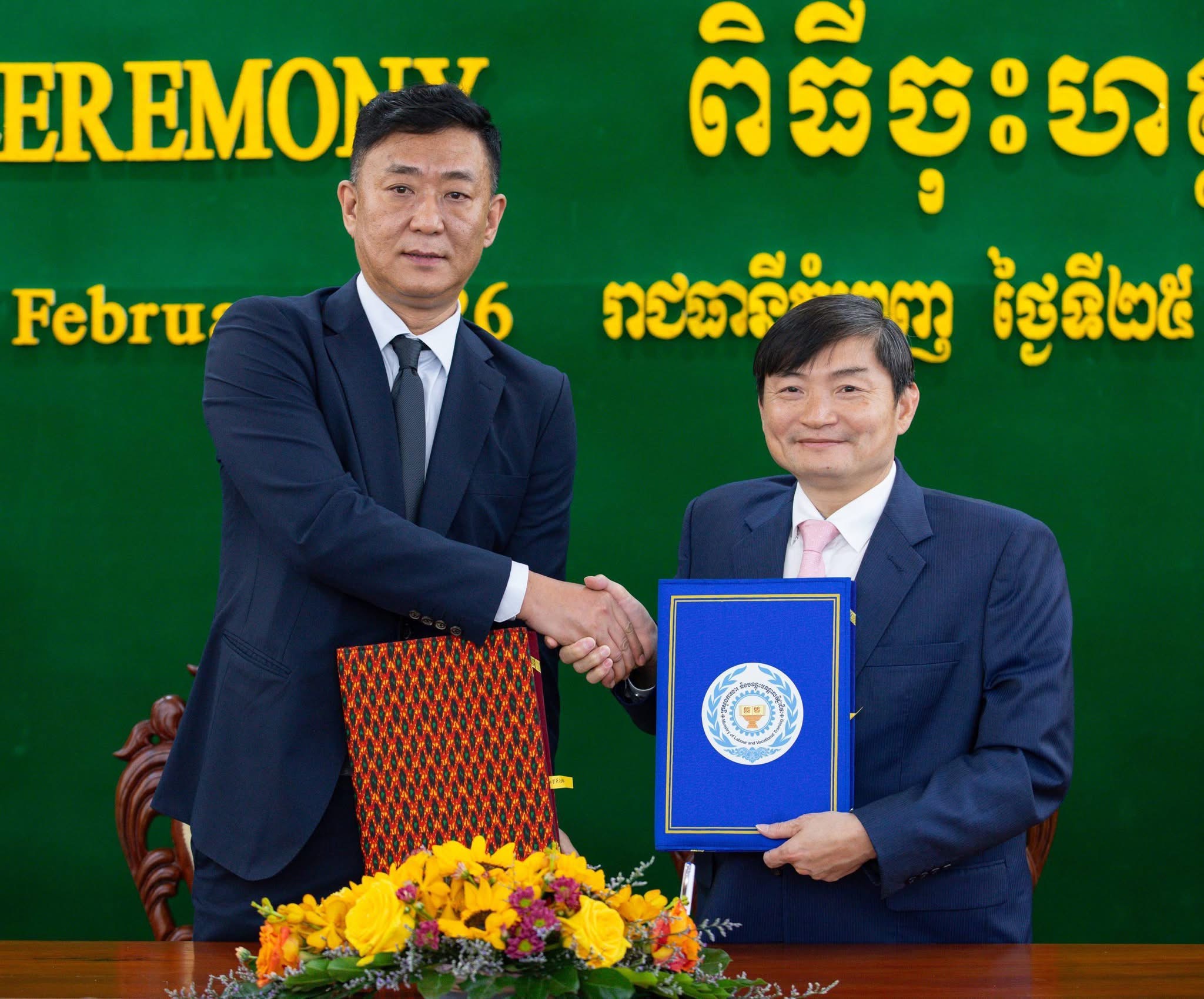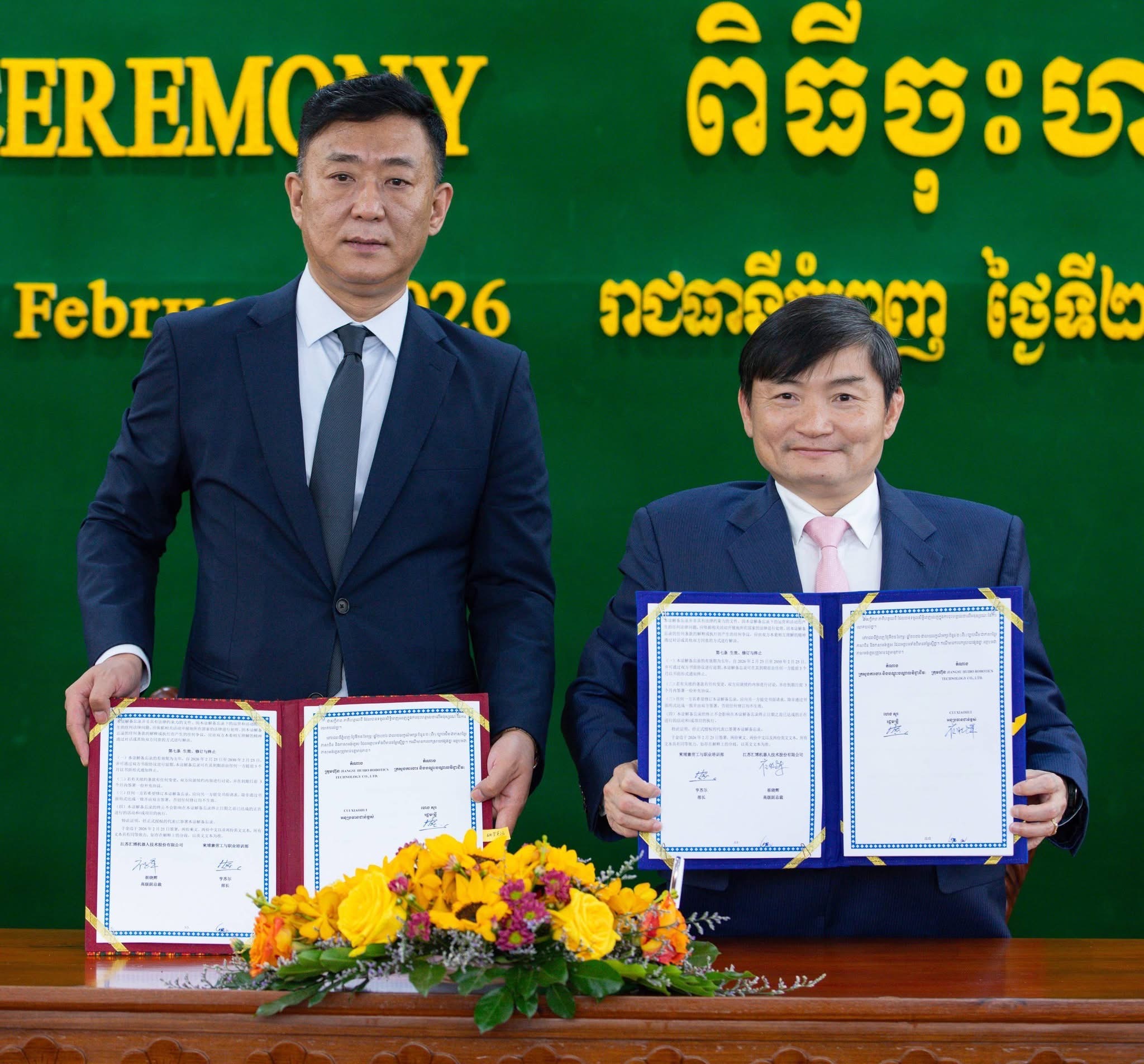 (ភ្នំពេញ)៖ ឯកឧត្ដម ហេង សួរ រដ្ឋមន្ត្រីក្រសួងការងារ និងបណ្ដុះបណ្ដាលវិជ្ជាជីវៈ និងលោក Cui Xiaohui អនុប្រធានជាន់ខ្ពស់នៃក្រុមហ៊ុន JIANGSU HUIBO ROBOTICS TECHNOLOGY CO., LTD. បានចុះអនុស្សរណៈនៃការយោគយល់គ្នា (MoU) ស្តីពី “ភាពជាដៃគូយុទ្ធសាស្ត្រក្នុងវិស័យអប់រំបណ្តុះបណ្តាលបច្ចេកទេស និងវិជ្ជាជីវៈ” នារសៀលថ្ងៃពុធ ទី២៥ ខែកុម្ភៈ ឆ្នាំ២០២៦ នៅទីស្តីការក្រសួង ក្នុងទិសដៅពង្រឹងកិច្ចសហប្រតិបត្តិការក្នុងការអភិវឌ្ឍជំនាញ ការផ្ទេរបច្ចេកវិទ្យា និងកិច្ចសហការលើសិក្សាស្រាវជ្រាវ ស្របតាមគំនិតផ្តួចផ្តើមខ្សែក្រវាត់ និងផ្លូវ និងការផ្តល់អាទិភាពជំរុញការអភិវឌ្ឍធនធានមនុស្សនៅកម្ពុជា។