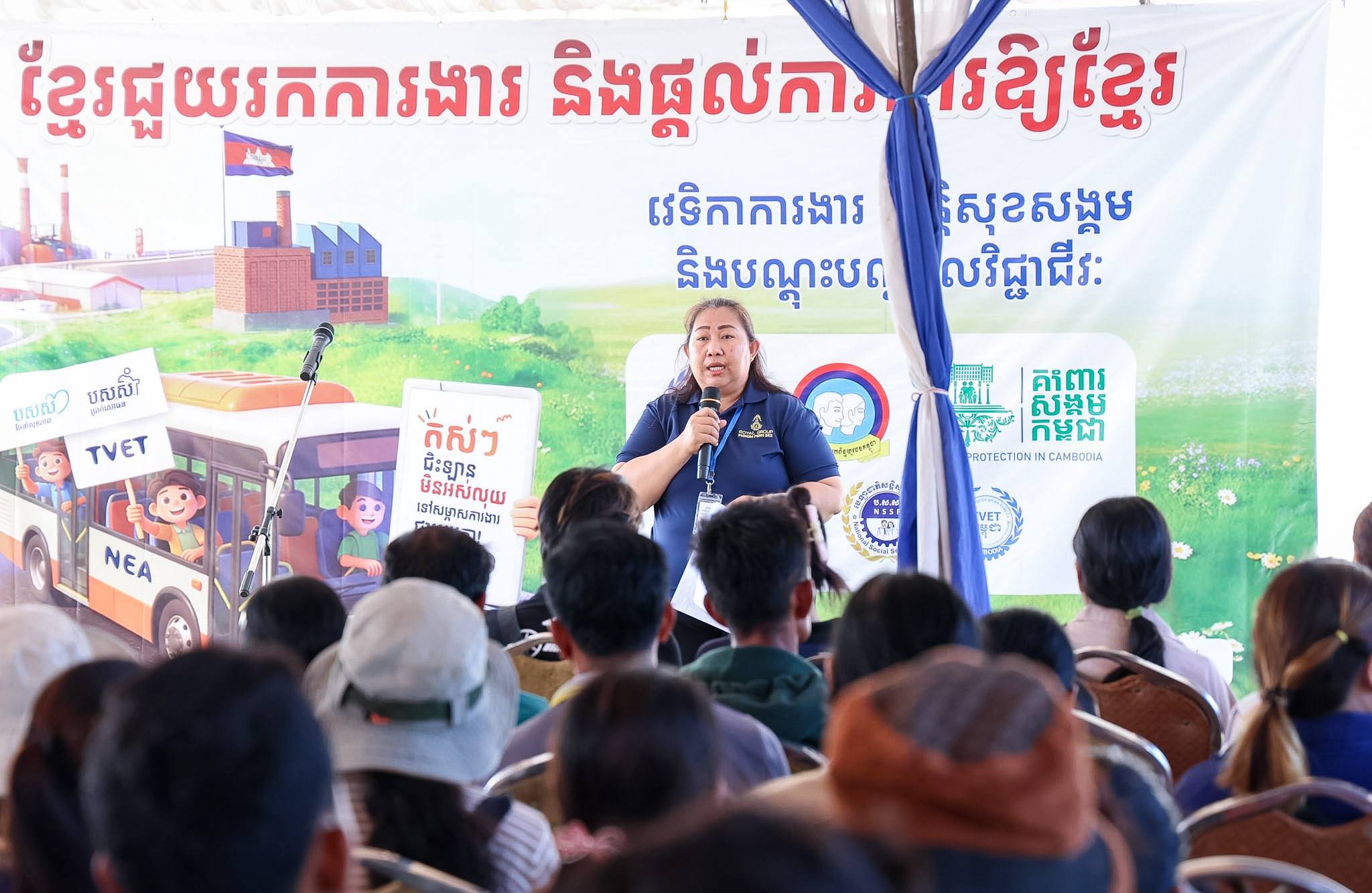 ក្នុងឱកាសនោះ ឯកឧត្តម យឹម ស៊ីណន រដ្ឋលេខាធិការ តំណាងដ៏ខ្ពង់ខ្ពស់ ឯកឧត្តម ហេង សួរ រដ្ឋមន្ត្រីក្រសួងការងារ និងបណ្ដុះបណ្ដាលវិជ្ជាជីវៈ បានគូសបញ្ជាក់ថា ការសម្រេចចិត្តចាប់យកឱកាសការងារក្នុងស្រុក គឺជាជម្រើសដ៏វៃឆ្លាតបំផុតក្នុងការកសាងជីវភាពគ្រួសារឱ្យកាន់តែប្រសើរ ព្រោះវាជួយឱ្យបងប្អូនចៀសផុតពីការរើសអើង និងហានិភ័យផ្សេងៗ ហើយអ្វីដែលរឹតតែមានតម្លៃនោះ គឺការបានរស់នៅជួបជុំក្រុមគ្រួសារយ៉ាងកក់ក្តៅ។ ជាមួយគ្នានេះ បងប្អូនដែលក្លាយជាបុគ្គលិកកម្មករនឹងទទួលបានអត្ថប្រយោជន៍លើសលប់ពីបណ្ណ ប.ស.ស. ដូចជាការពិនិត្យព្យាបាលជំងឺដោយឥតគិតថ្លៃ និងការទទួលបានប្រាក់សោធននិវត្តន៍សម្រាប់ធានាប្រាក់ចំណូលនៅពេលចាស់ជរាដូចមន្ត្រីរាជការផងដែរ។