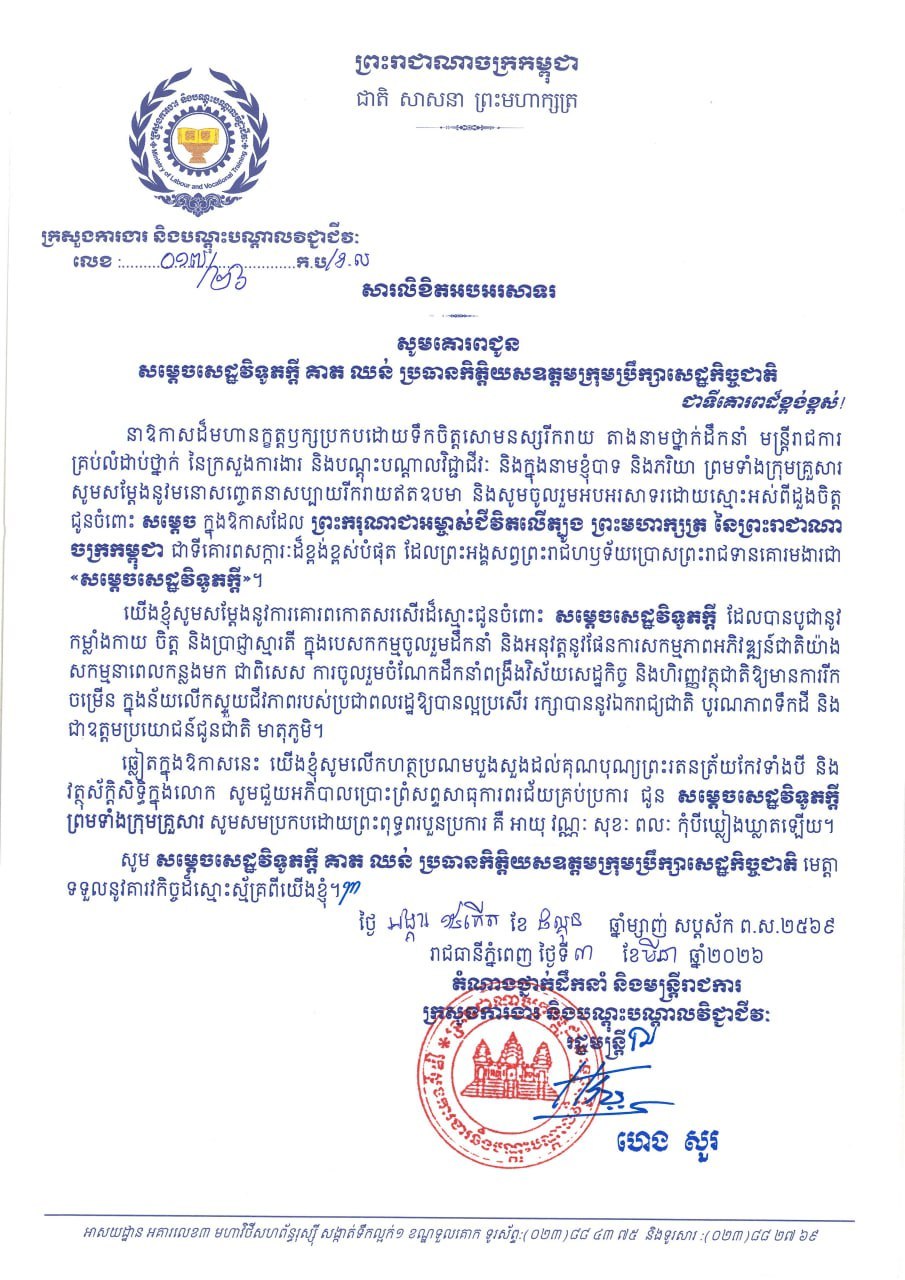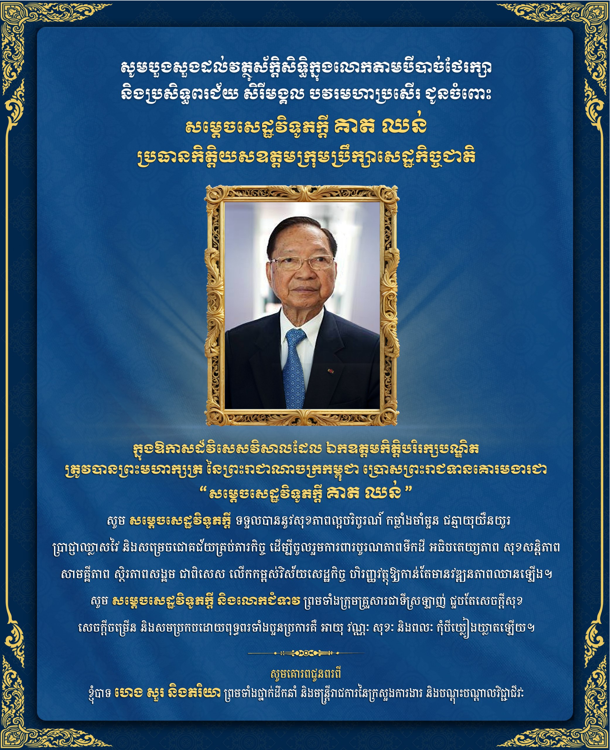 ភ្នំពេញ:ឯកឧត្តម ហេង សួរ និងភរិយា ព្រមទាំងថ្នាក់ដឹកនាំ និងមន្ត្រីរាជការ នៃក្រសួងការងារ និងបណ្ដុះបណ្ដាលវិជ្ជាជីវៈ សូមអបអរសាទរ និងគោរពជូនចំពោះឯកឧត្តមកិត្តិបរិរក្សបណ្ឌិត គាត ឈន់ ក្នុងឱកាសទទួលបានការប្រោសព្រះរាជទានគោរមងារជា «សម្តេចសេដ្ឋវិទូភក្តី គាត ឈន់» ពីព្រះមហាក្សត្រនៃព្រះរាជាណាចក្រកម្ពុជា។