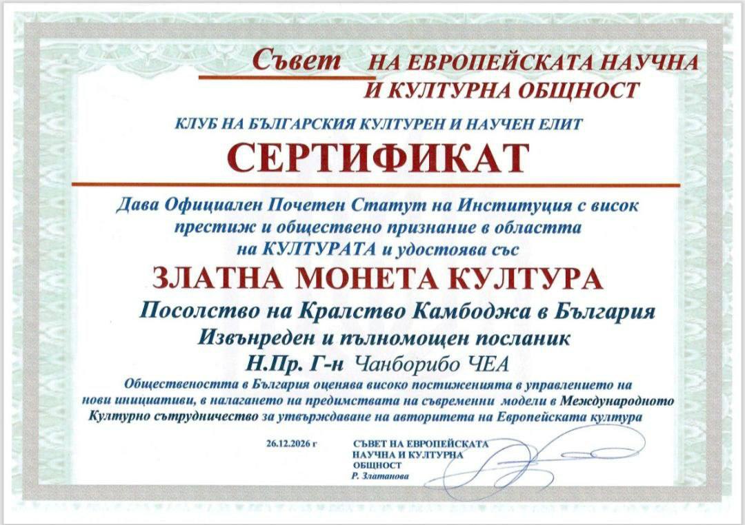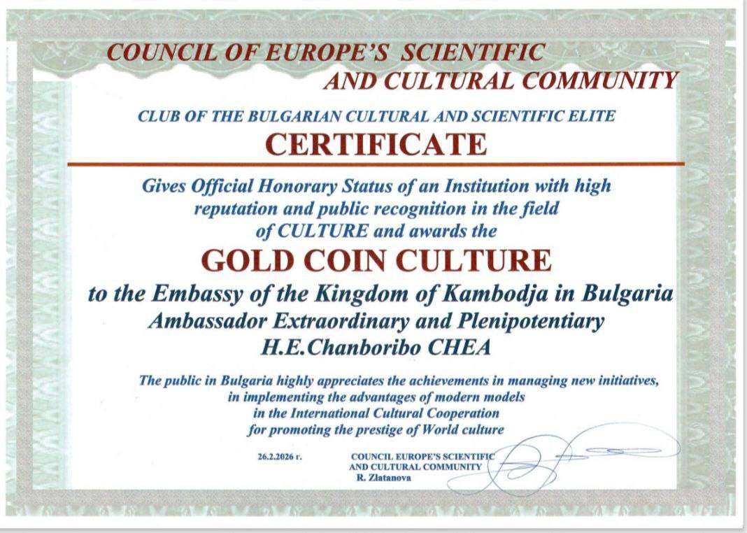 ទីក្រុងសូហ្វីយ៉ា, សាធារណរដ្ឋប៊ុលហ្គារី – កាលពីសប្តាហ៍កន្លងទៅនេះ ឯកអគ្គរាជទូតកម្ពុជា ប្រចាំសាធារណរដ្ឋប៊ុលហ្គារី បានទទួលពានកាក់មាស ក្នុងព្រឹត្តិការណ៍អន្តរជាតិមួយ ដែល រៀបចំដោយ Conncil of Europe’s Scien Tificand cultural Community ដែលមានការចូលរួមរបស់អ្នកសម្ដែង និងតំណាងអន្តរជាតិជាច្រើន។