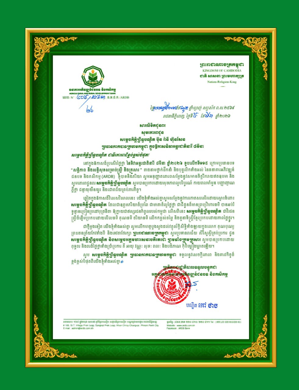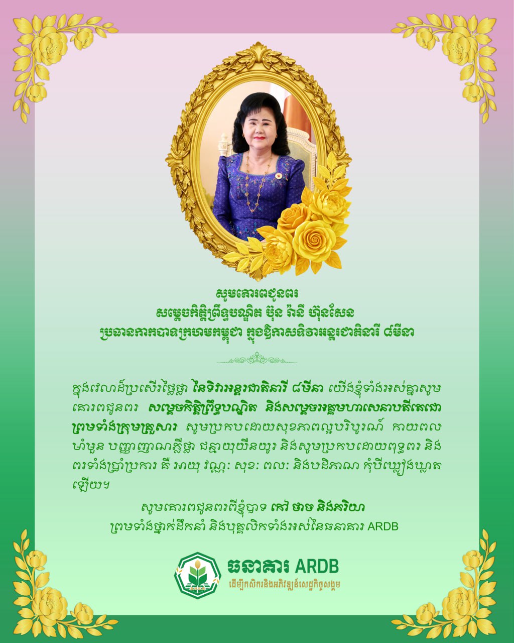 ភ្នំពេញ៖ ឯកឧត្ដមបណ្ឌិត កៅ ថាច ប្រតិភូរាជរដ្ឋាភិបាលទទួលបន្ទុកជាអគ្គនាយកធនាគារអភិវឌ្ឍន៍ជនបទ និងកសិកម្ម (ARDB)សូមគោរពជូនពរ សម្ដេចកិត្តិព្រឹទ្ធបណ្ឌិត ប៊ុន រ៉ានី ហ៊ុនសែនប្រធានកាកបាទក្រហមកម្ពុជា ក្នុងឱកាសទិវាអន្តរជាតិនារី ៨មីនា។