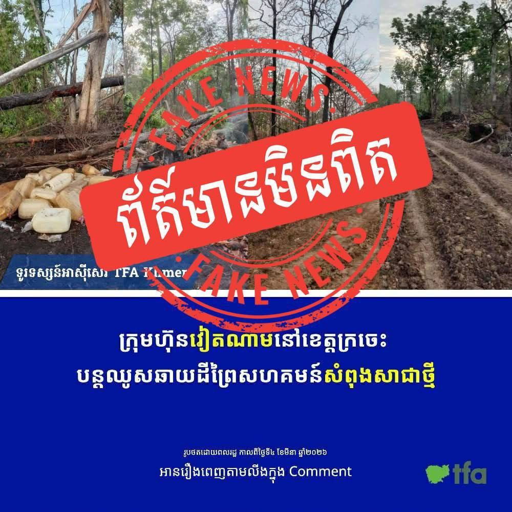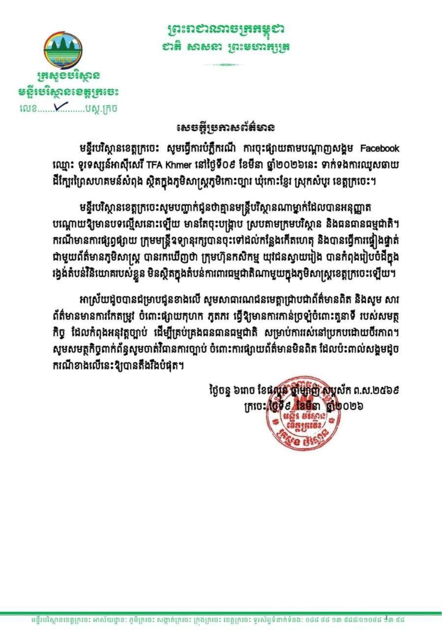 ក្រចេះ:សេចក្តីប្រកាសព័ត៌មាន របស់មន្ទីរបរិស្ថានខេត្តក្រចេះ ស្តីពីការបំភ្លឺករណី ការចុះផ្សាយតាមបណ្តាញសង្គម Facebook ឈ្មោះ ទូរទស្សន៍អាស៊ីសេរី TFA Khmer នៅថ្ងៃទី០៩ ខែមីនា ឆ្នាំ២០២៦នេះ ទាក់ទងការឈូសឆាយ ដីក្បែរព្រៃសហគមន៍សំពុង ស្ថិតក្នុងភូមិសាស្ត្រភូមិកោះច្បារ ឃុំកោះខ្មែរ ស្រុកសំបូរ ខេត្តក្រចេះ។
