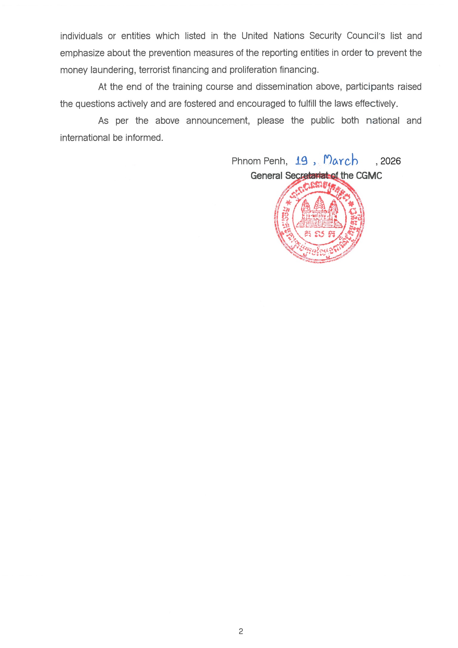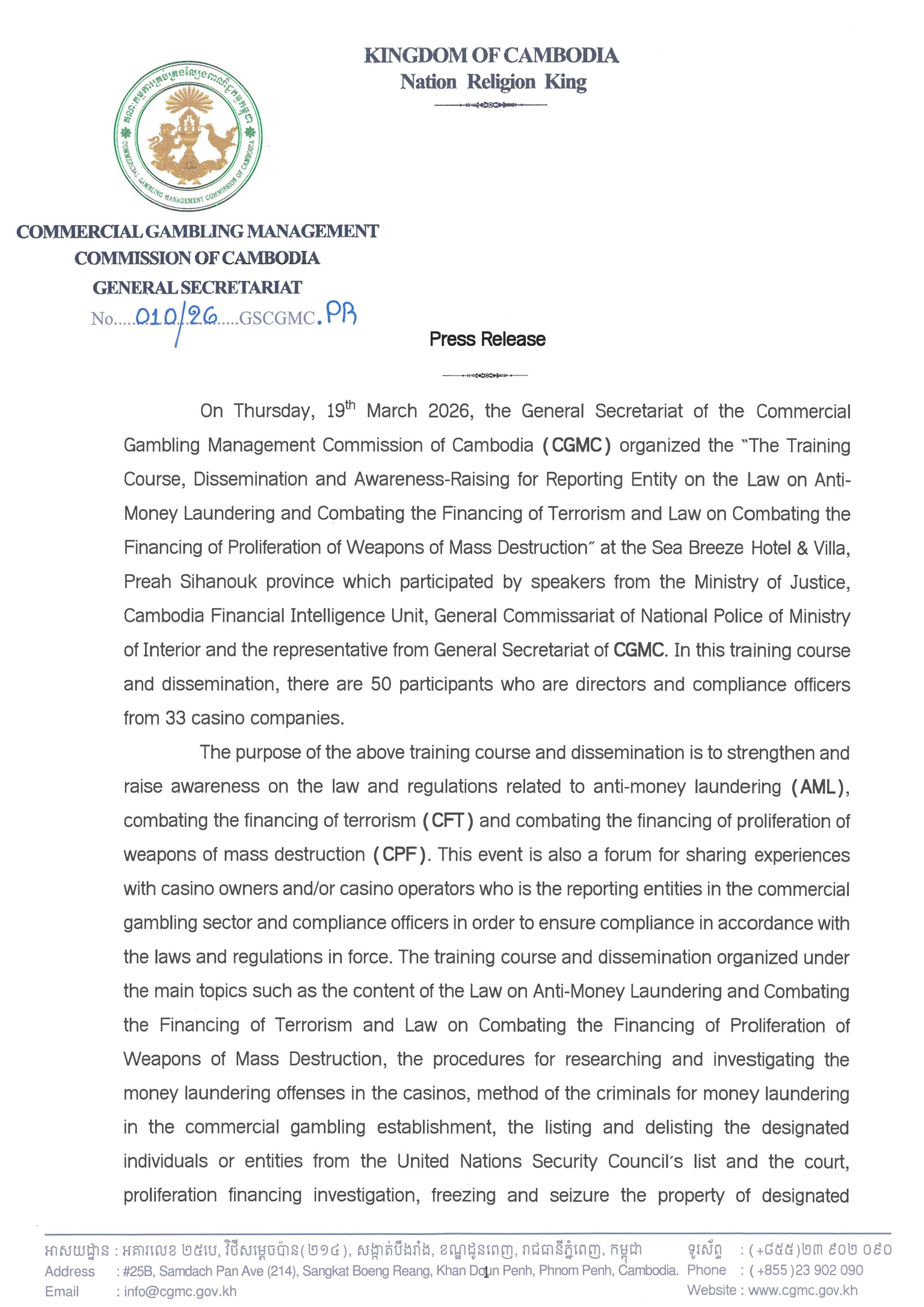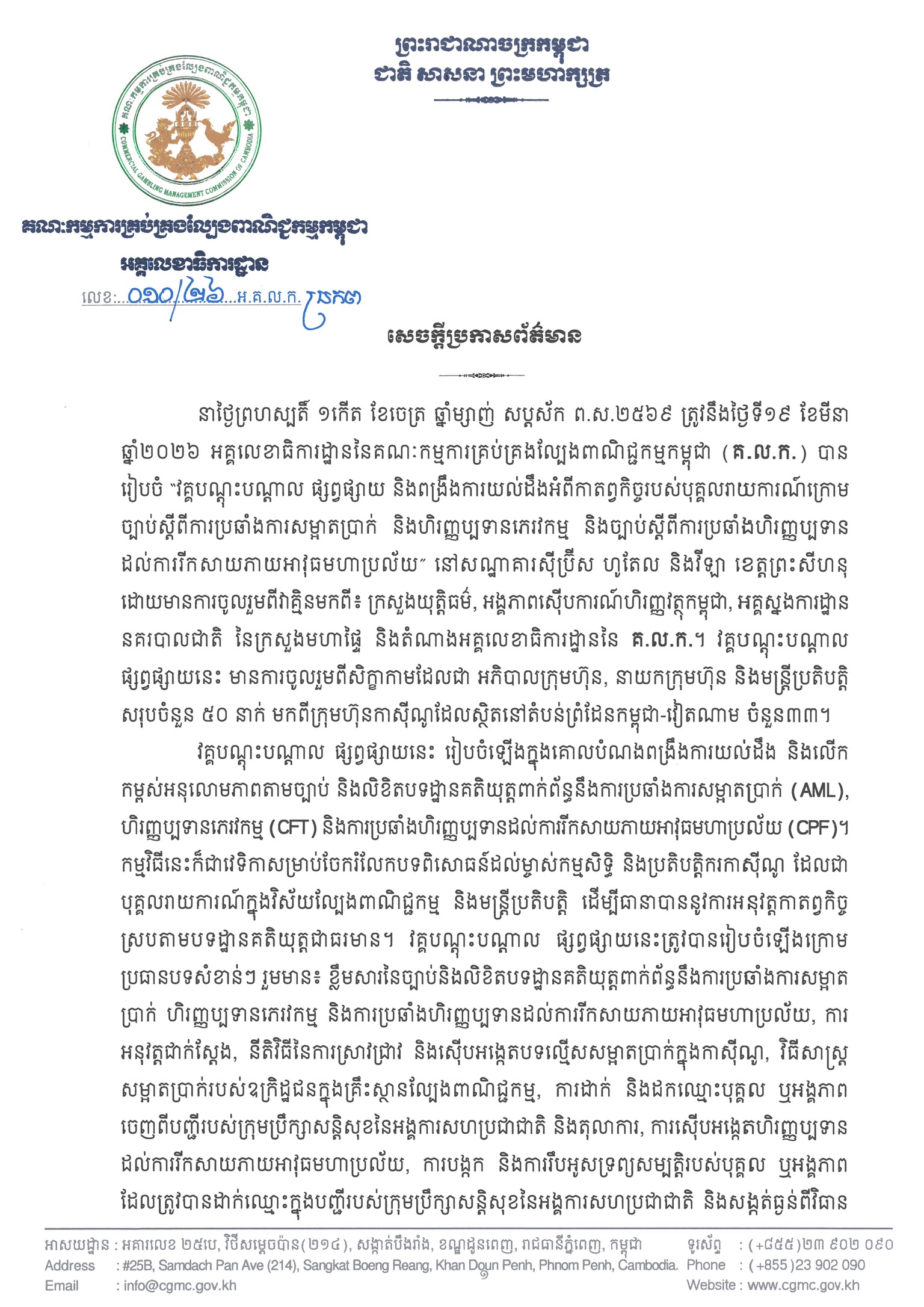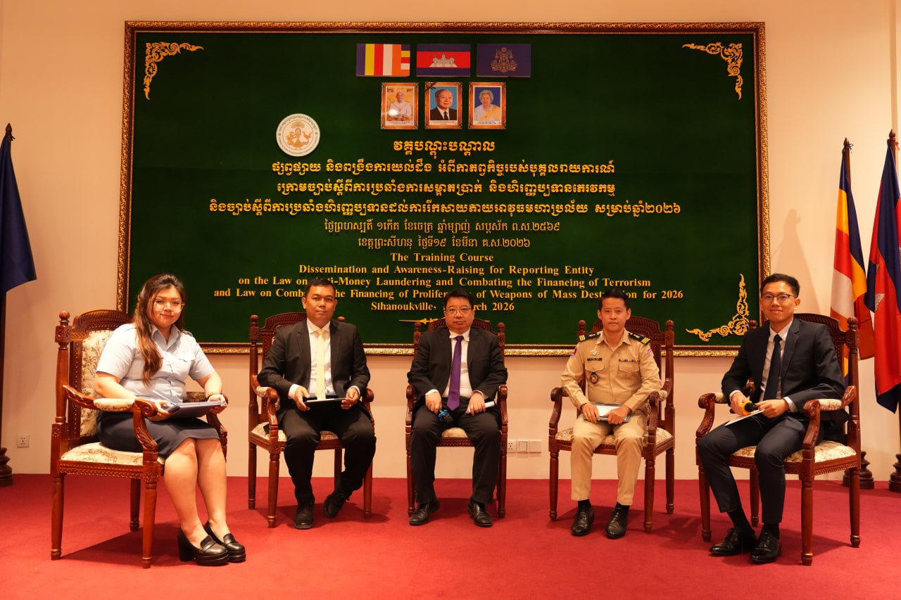ភ្នំពេញ៖ អគ្គលេខាធិការដ្ឋាននៃគណៈកម្មការគ្រប់គ្រងល្បែងពាណិជ្ជកម្មកម្ពុជា (គ.ល.ក.) នៅទី១៩ ខែមីនា ឆ្នាំ២០២៦នេះ បានរៀបចំ “វគ្គបណ្ដុះបណ្ដាល ផ្សព្វផ្សាយ និងពង្រឹងការយល់ដឹងអំពីកាតព្វកិច្ចរបស់បុគ្គលរាយការណ៍ក្រោមច្បាប់ស្ដីពីការប្រឆាំងការសម្អាតប្រាក់ និងហិរញ្ញប្បទានភេរវកម្ម និងច្បាប់ស្តីពីការប្រឆាំងហិរញ្ញប្បទានដល់ការរីកសាយភាយអាវុធមហាប្រល័យ”។