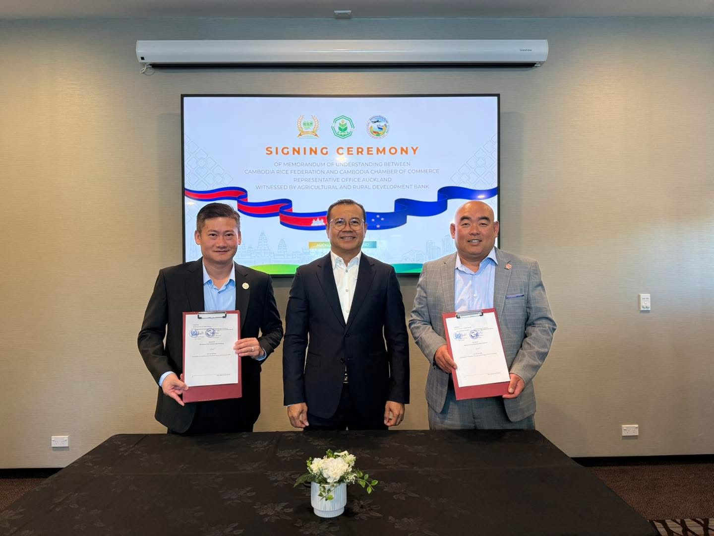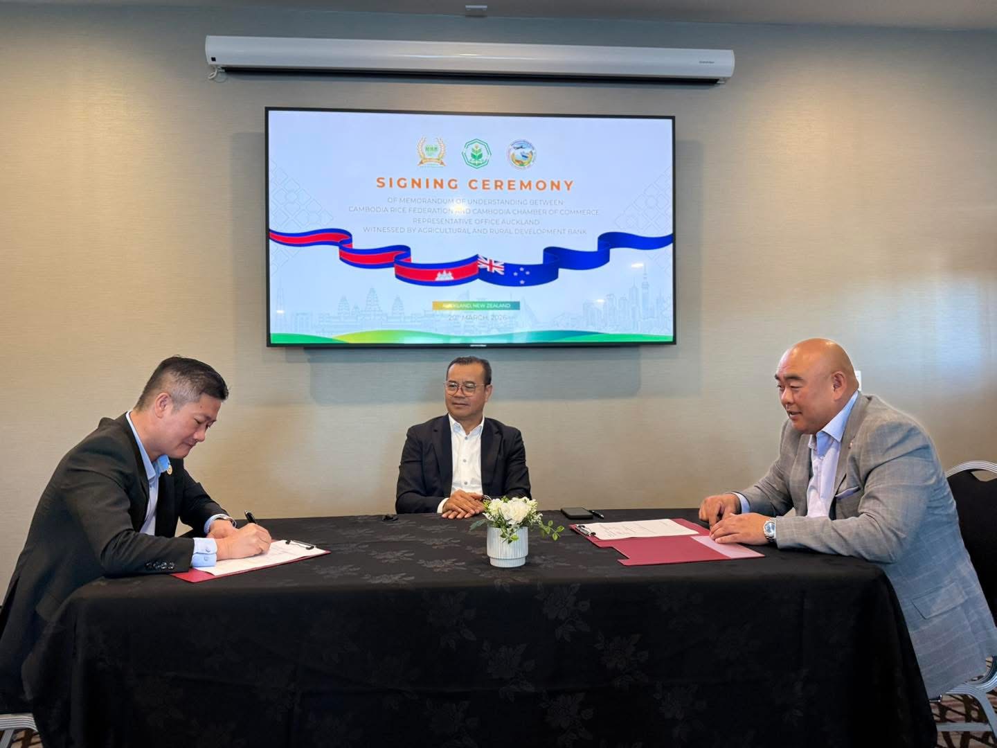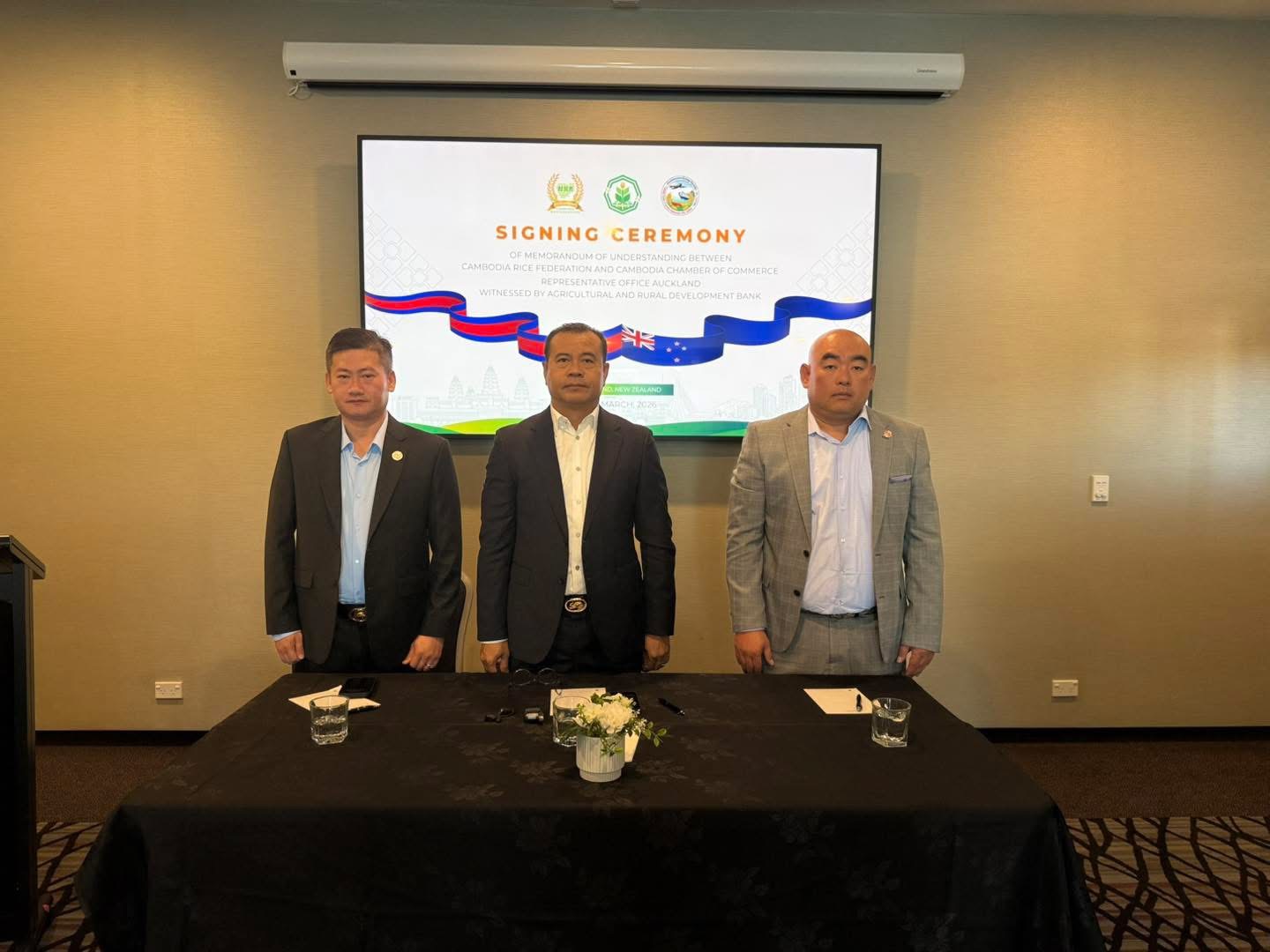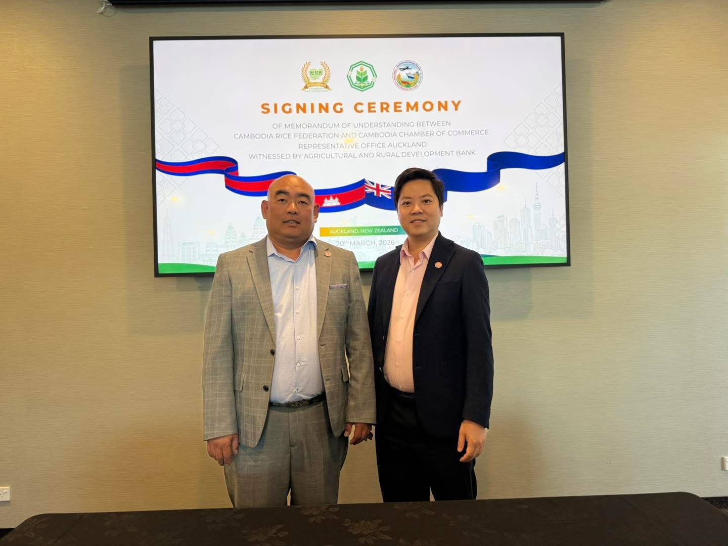 On Friday, 20 March 2026, in Auckland, New Zealand, the Cambodia Rice Federation (CRF), led by Oknha Lay Chhun Hour, President of the Cambodia Rice Federation, attended and signed the Memorandum of Understanding (MoU) with the Cambodia Chamber of Commerce Representative Office Auckland, led by Mr. Khuy Michael, Chairman of the Cambodia Chamber of Commerce in Auckland, New Zealand. The ceremony was presided over and witnessed by H.E. Dr. Kao Thach, Delegate of the Royal Government of Cambodia in charge as CEO of the Agriculture and Rural Development Bank.
