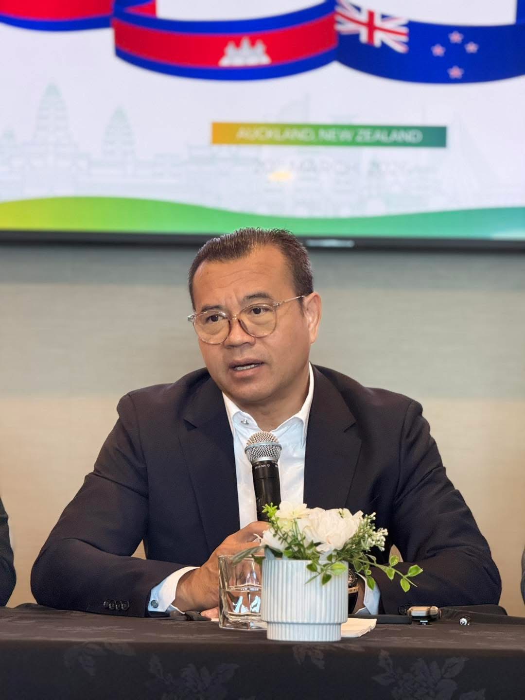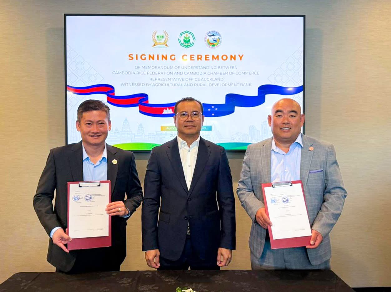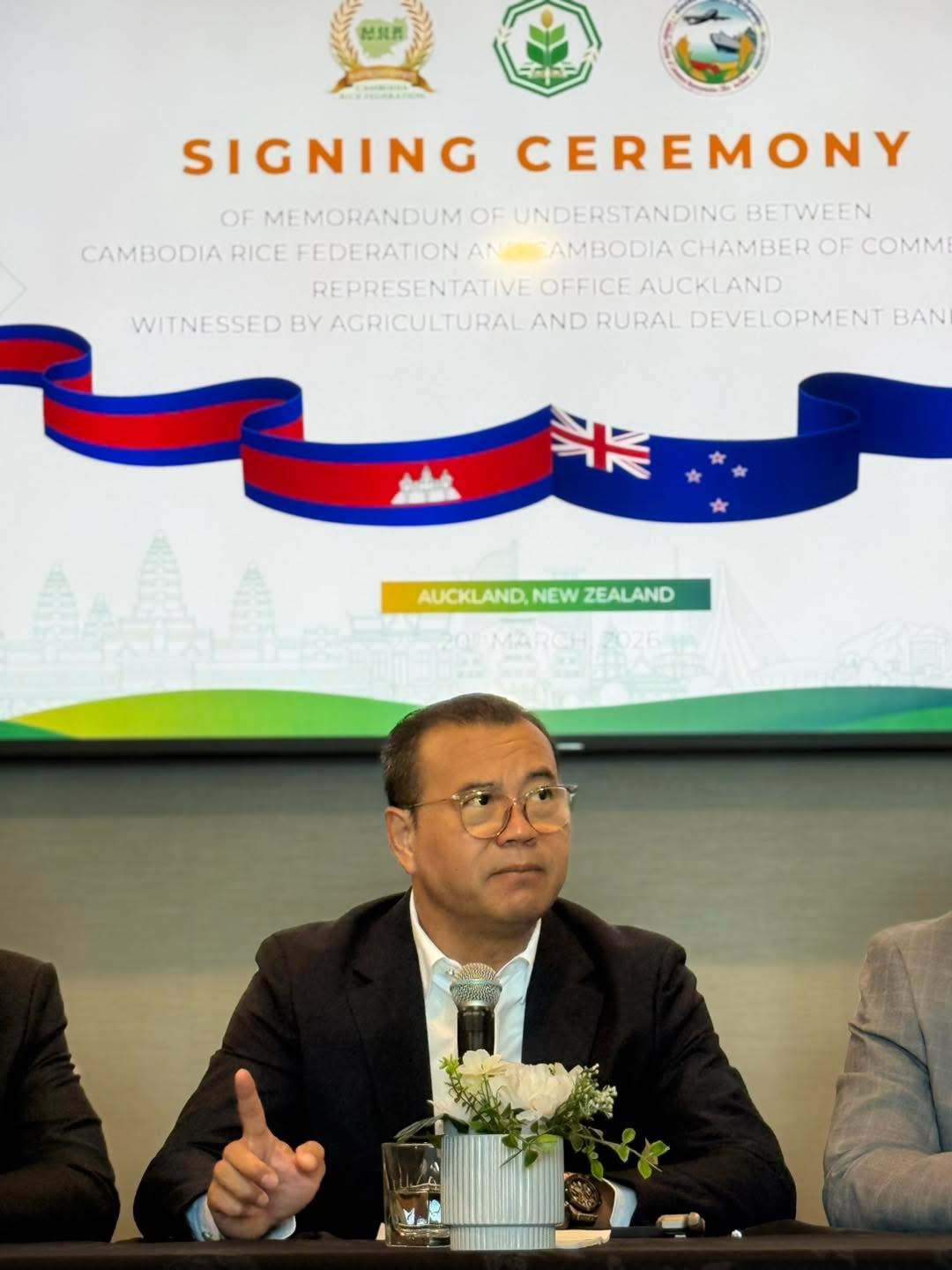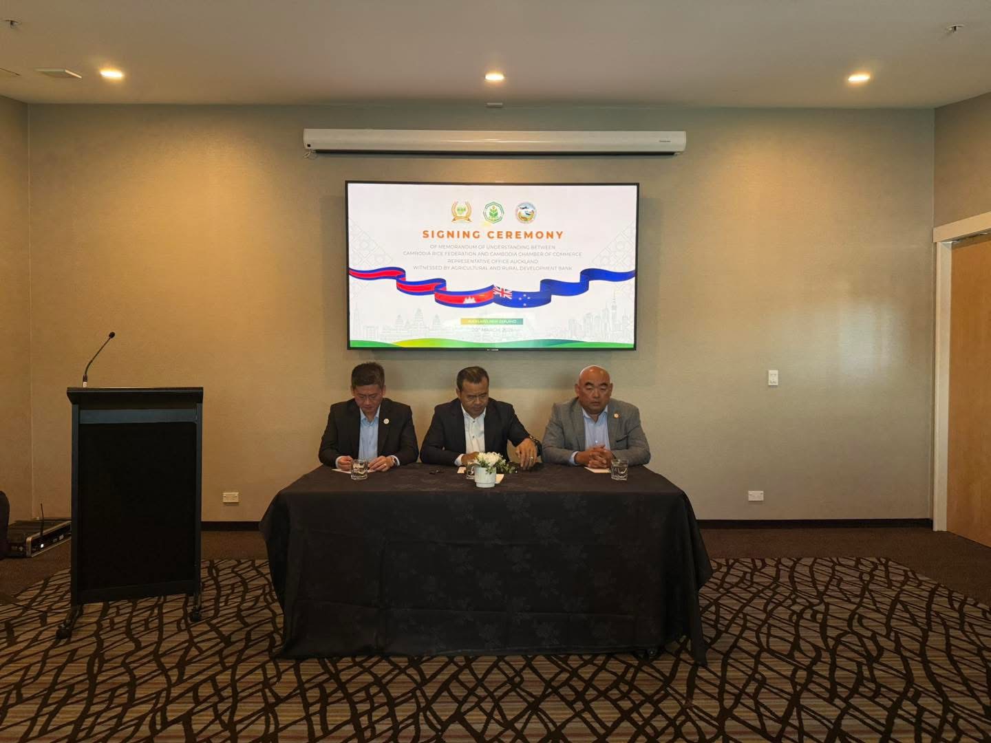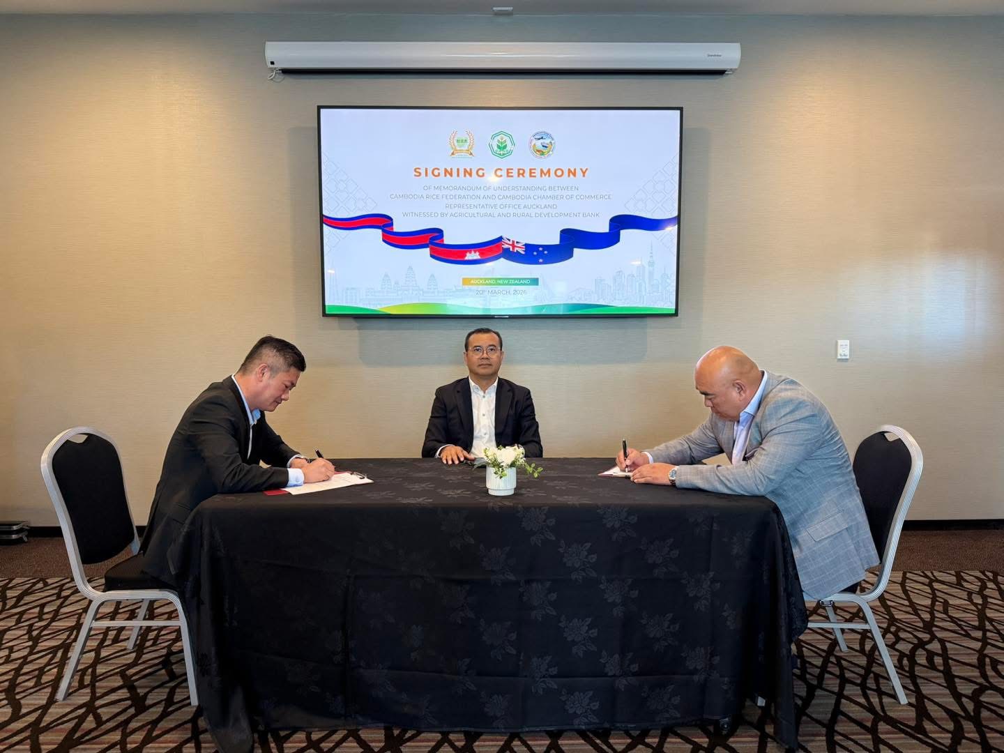 On Friday, 20 March 2026, in Auckland, New Zealand, the Cambodia Rice Federation (CRF), led by Oknha Lay Chhun Hour, President of the Cambodia Rice Federation, attended and signed the Memorandum of Understanding (MoU) with the Cambodia Chamber of Commerce Representative Office Auckland, led by Mr. Khuy Michael, Chairman of the Cambodia Chamber of Commerce in Auckland, New Zealand. The ceremony was presided over and witnessed by H.E. Dr. Kao Thach, Delegate of the Royal Government of Cambodia in charge as CEO of the Agriculture and Rural Development Bank.