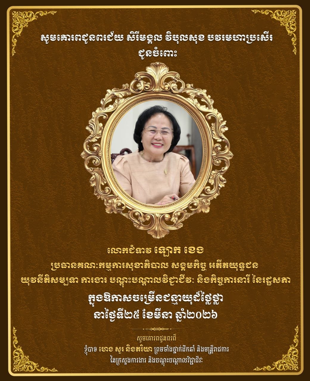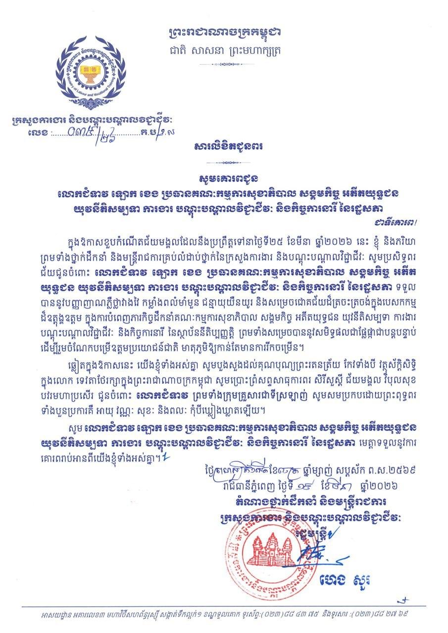 ភ្នំពេញ:ឯកឧត្តម ហេង សួរ និងភរិយា ព្រមទាំងថ្នាក់ដឹកនាំ និងមន្ត្រីរាជការ នៃក្រសួងការងារ និងបណ្តុះបណ្តាលវិជ្ជាជីវៈ សូមប្រសិទ្ធពរជ័យគោរពជូនចំពោះ លោកជំទាវ ឡោក ខេង ប្រធានគណៈកម្មការសុខាភិបាល សង្គមកិច្ច អតីតយុទ្ធជន យុវនីតិសម្បទា ការងារ បណ្ដុះបណ្ដាលវិជ្ជាជីវៈ និងកិច្ចការនារី នៃរដ្ឋសភា ក្នុងឱកាសចម្រើនជន្មាយុដ៏ថ្លៃថ្លា ដែលប្រព្រឹត្តទៅនាថ្ងៃទី២៥ ខែមីនា ឆ្នាំ២០២៦។