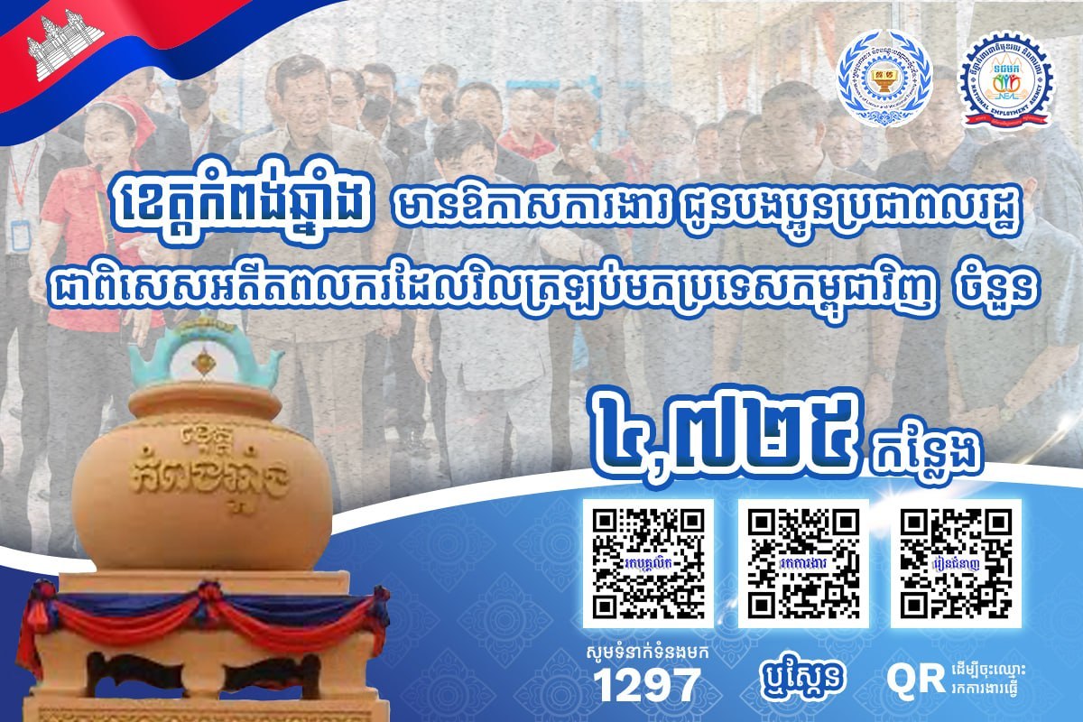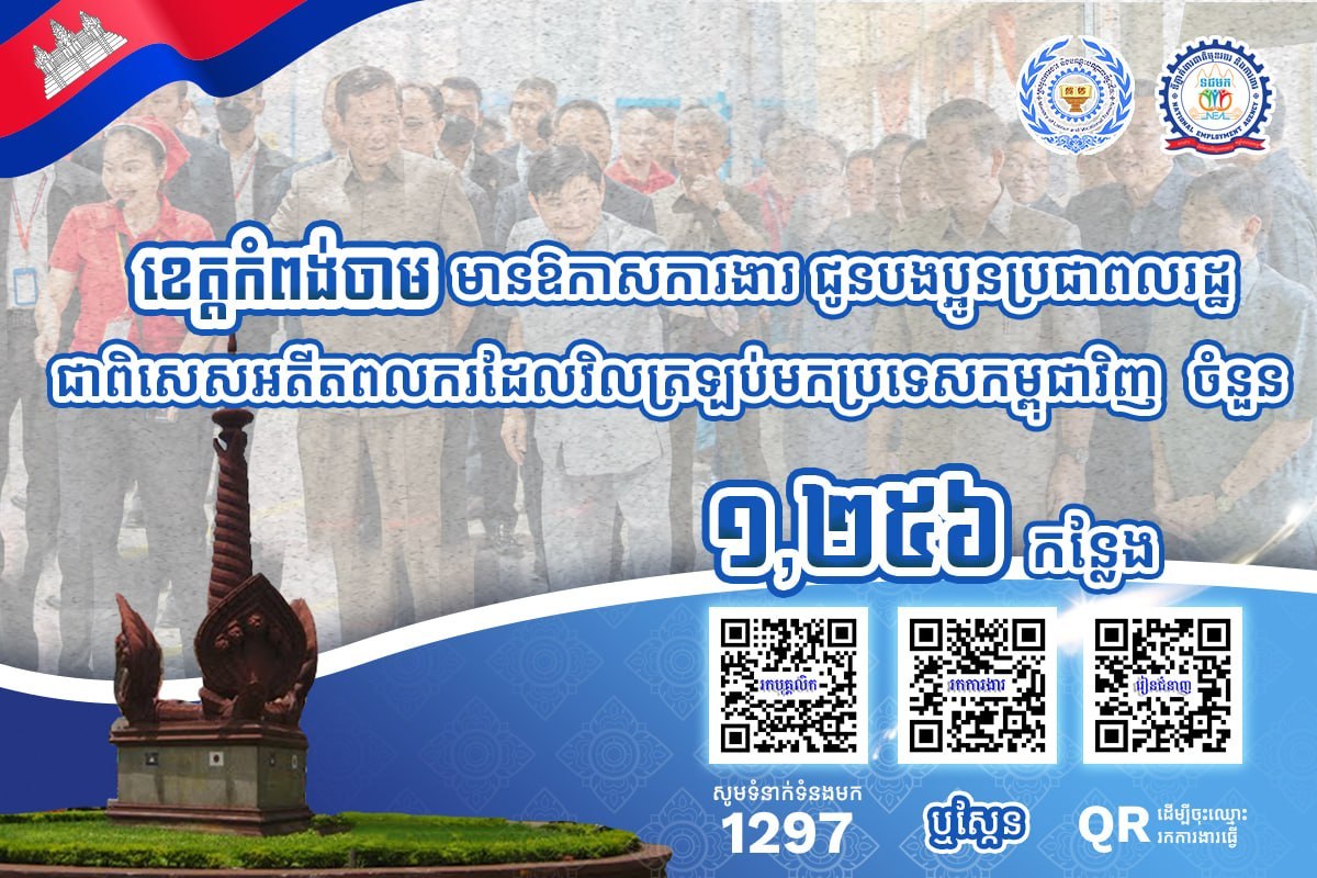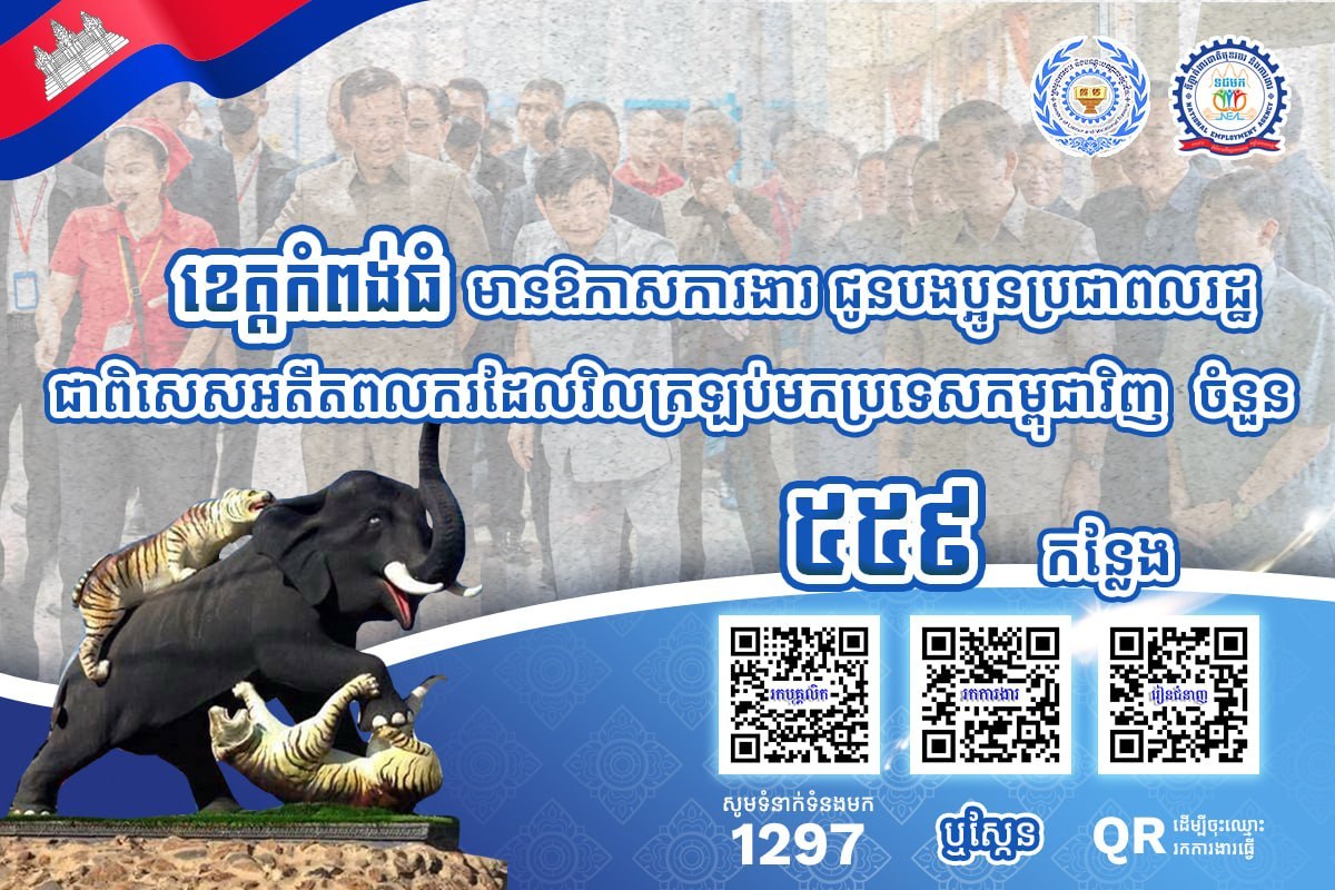 តាមរយៈការផ្សព្វផ្សាយ ក្រសួងការងារបានឱ្យដឹងថា គិតត្រឹមថ្ងៃទី៣ ខែមេសា ឆ្នាំ២០២៦នេះ ខេត្តកំពង់ចាម ខេត្តកំពង់ឆ្នាំង និងខេត្តកំពង់ធំមានឱកាសការងារសរុបចំនួន ៦,៥៤០កន្លែង កំពុងរង់ចាំបងប្អូនអតីតពលករត្រឡប់មកពីប្រទេសថៃ និងអ្នកកំពុងស្វែងរកការងារធ្វើនៅក្នុងវិស័យកសិកម្ម ឧស្សាហកម្ម និងវិស័យសេវាកម្ម។