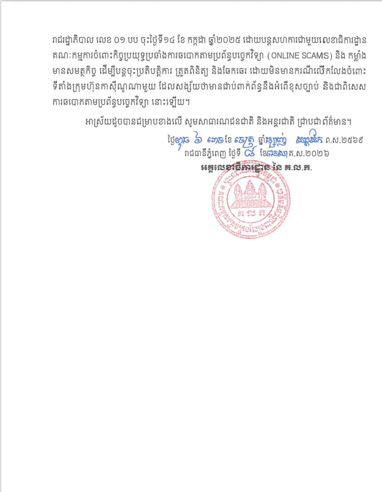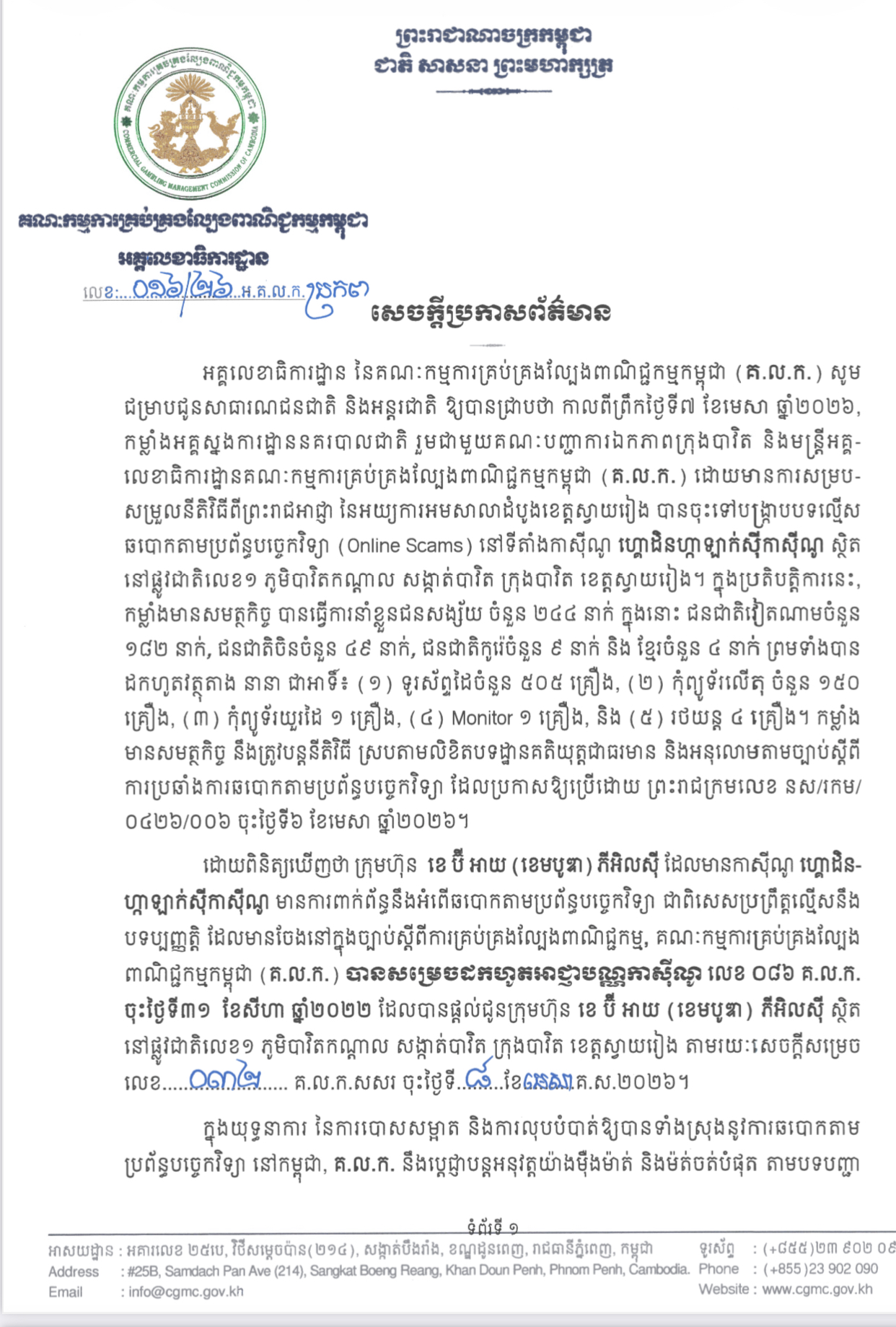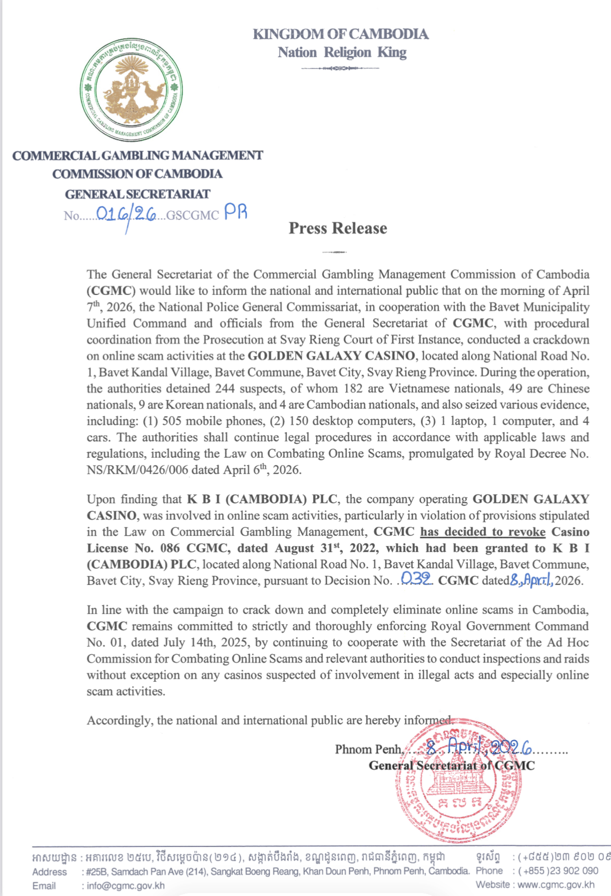 hereby issues Press Release No. 016/26 G.S.CGMC.PR, dated 8 April 2026, regarding the decision to revoke the licence of K B I (CAMBODIA) PLC, which operates the casino named GOLDEN GALAXY CASINO, located along National Road No.1, Bavet Kandal Village, Bavet Commune, Bavet City, Svay Rieng Province.