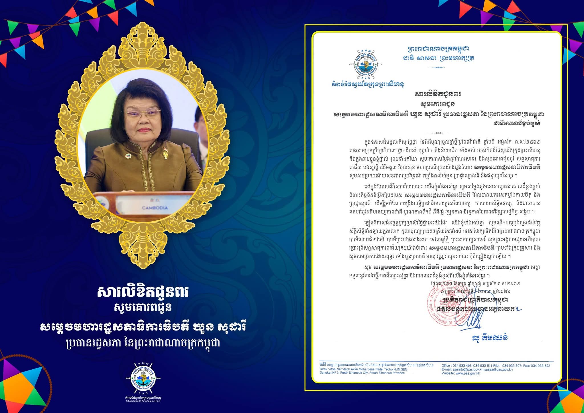 ភ្នំពេញ:ឯកឧត្តម លូ គឹមឈន់ ប្រតិភូរាជរដ្ឋាភិបាលកម្ពុជាទទួលបន្ទុកជាអគ្គនាយកកំពង់ផែស្វយ័តក្រុងព្រះសីហនុនិងលោកជំទាវ សូមគោរពជូន សម្តេចមហារដ្ឋសភាធិការធិបតី ឃួន សុដារី ប្រធានរដ្ឋសភានៃព្រះរាជាណាចក្រកម្ពុជា ក្នុងឱកាសដ៏មង្គលាភិរម្យថ្លៃថ្លា នៃពិធីបុណ្យចូលឆ្នាំថ្មីប្រពៃណីជាតិ ឆ្នាំមមី អដ្ឋស័ក ព.ស.២៥៦៩ ពីកំពង់ស្វយ័តក្រុងព្រះសីហនុ។