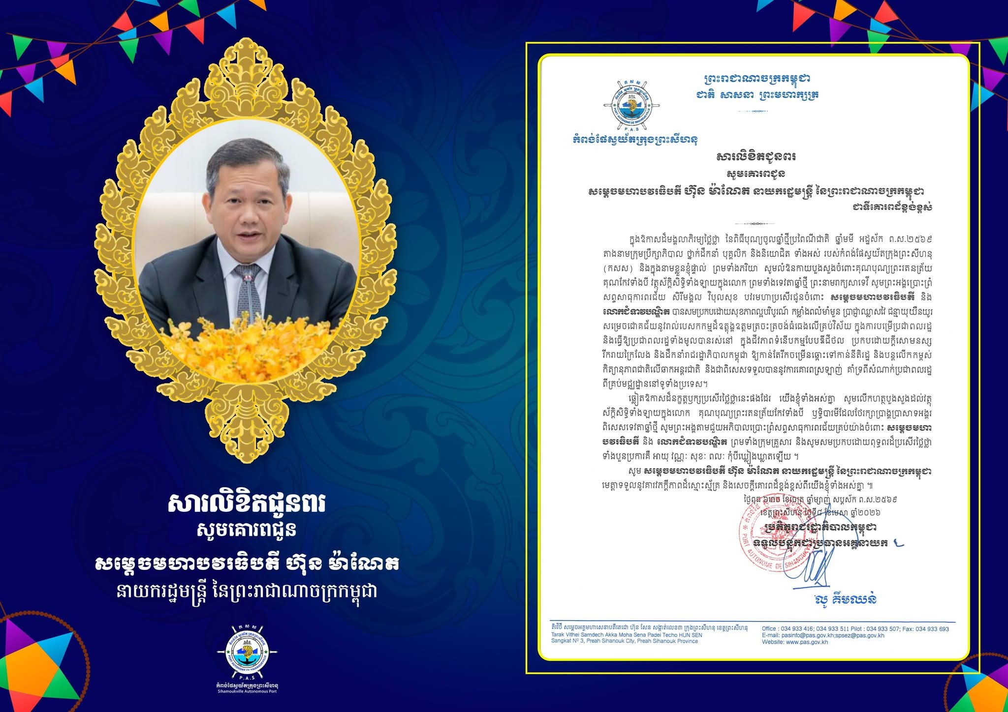 ភ្នំពេញ:ឯកឧត្តម លូ គឹមឈន់ ប្រតិភូរាជរដ្ឋាភិបាលកម្ពុជាទទួលបន្ទុកជាអគ្គនាយកកំពង់ផែស្វយ័តក្រុងព្រះសីហនុនិងលោកជំទាវ សារលិខិតជូនពរ សូមគោរពជូន សម្តេចមហាបវរធិបតី ហ៊ុន ម៉ាណែត នាយករដ្ឋមន្ត្រី នៃព្រះរាជាណាចក្រកម្ពុជា ជាទីគោរពដ៏ខ្ពង់ខ្ពស់ក្នុងឱកាសដ៏មង្គលាភិរម្យថ្លៃថ្លា នៃពិធីបុណ្យចូលឆ្នាំថ្មីប្រពៃណីជាតិ ឆ្នាំមមី អដ្ឋស័ក ព.ស.២៥៦៩ ពីកំពង់ស្វយ័តក្រុងព្រះសីហនុ ។
