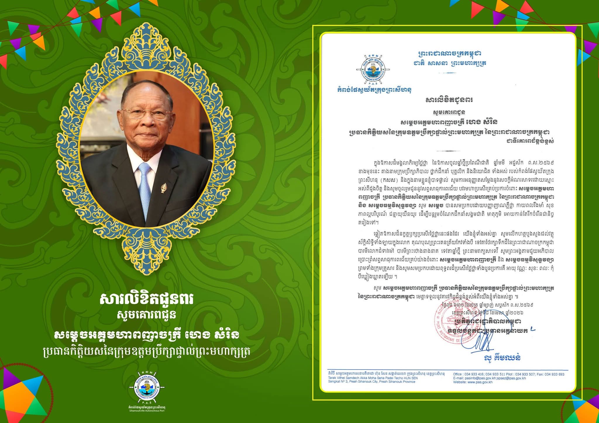 ភ្នំពេញ:ឯកឧត្តម លូ គឹមឈន់ ប្រតិភូរាជរដ្ឋាភិបាលកម្ពុជាទទួលបន្ទុកជាអគ្គនាយកកំពង់ផែស្វយ័តក្រុងព្រះសីហនុនិងលោកជំទាវ ចេញសារលិខិតជូនពរ សូមគោរពជូន សម្ដេចអគ្គមហាពញាចក្រី ហេង សំរិន ប្រធានកិត្តិយសនៃក្រុមឧត្តមប្រឹក្សាផ្ទាល់ព្រះមហាក្សត្រ ជាទីគោរពដ៏ខ្ពង់ខ្ពស់