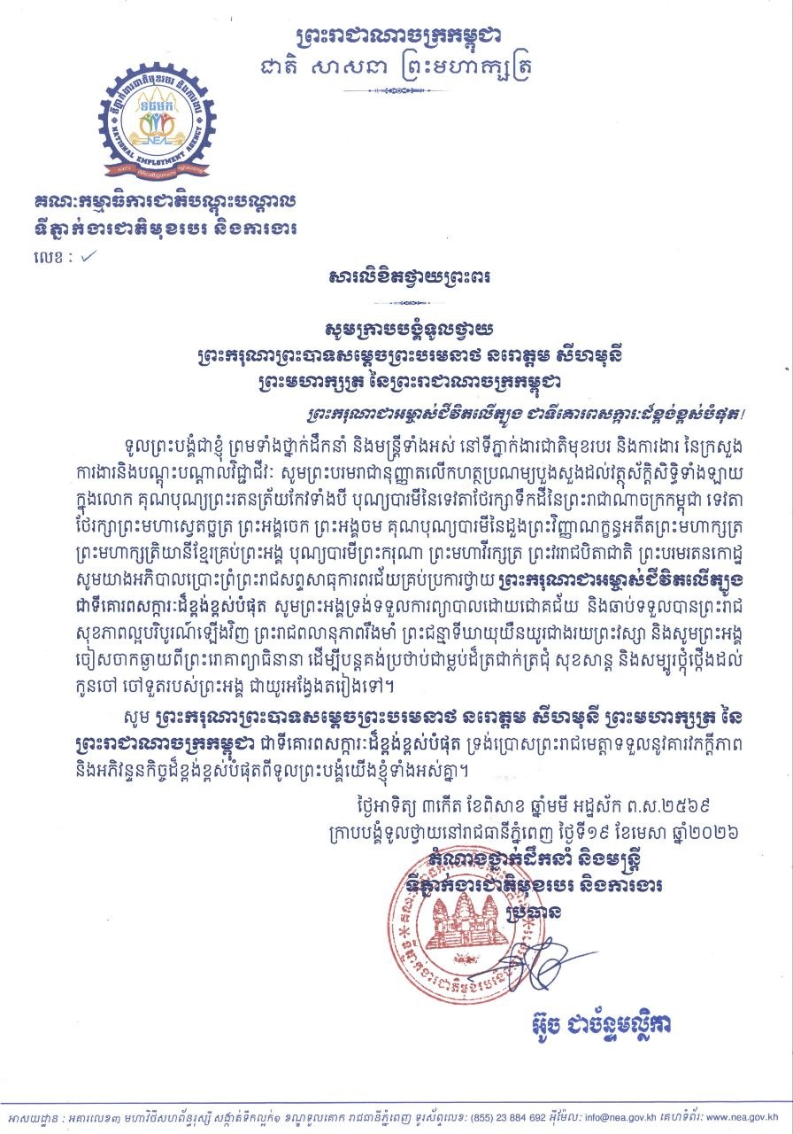 ទីភ្នាក់ងារជាតិមុខរបរ និងការងារ ផ្ញើសារលិខិតថ្វាយព្រះពរព្រះករុណាព្រះបាទសម្តេច ព្រះបរមនាថ នរោត្តម សីហមុនី ព្រះមហាក្សត្រ នៃព្រះរាជាណាចក្រកម្ពុជា ជាទីគោរពសក្ការៈដ៏ខ្ពង់ខ្ពស់បំផុត សូមឆាប់បានជាសះស្បើយពីព្រះរោគ
