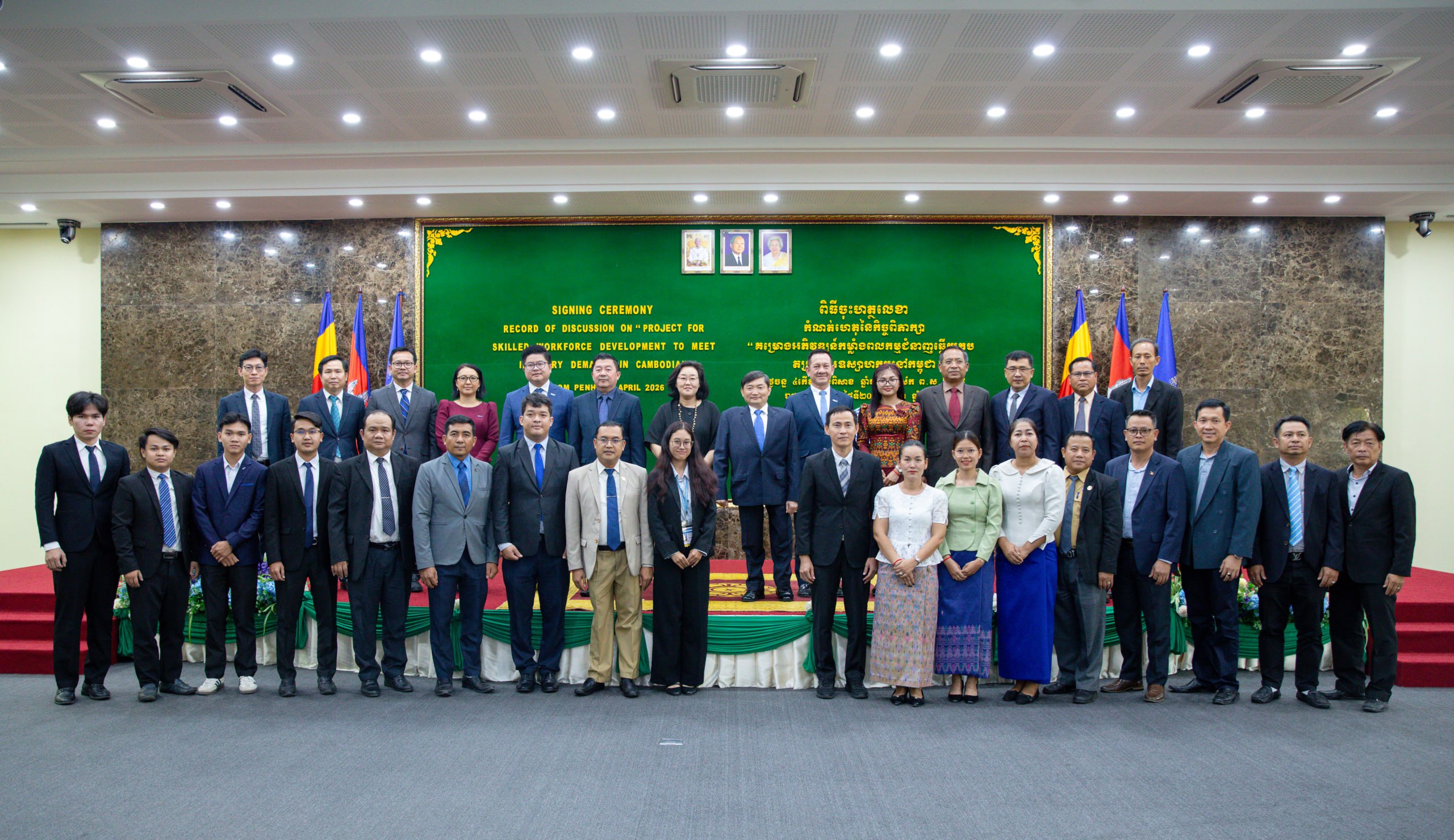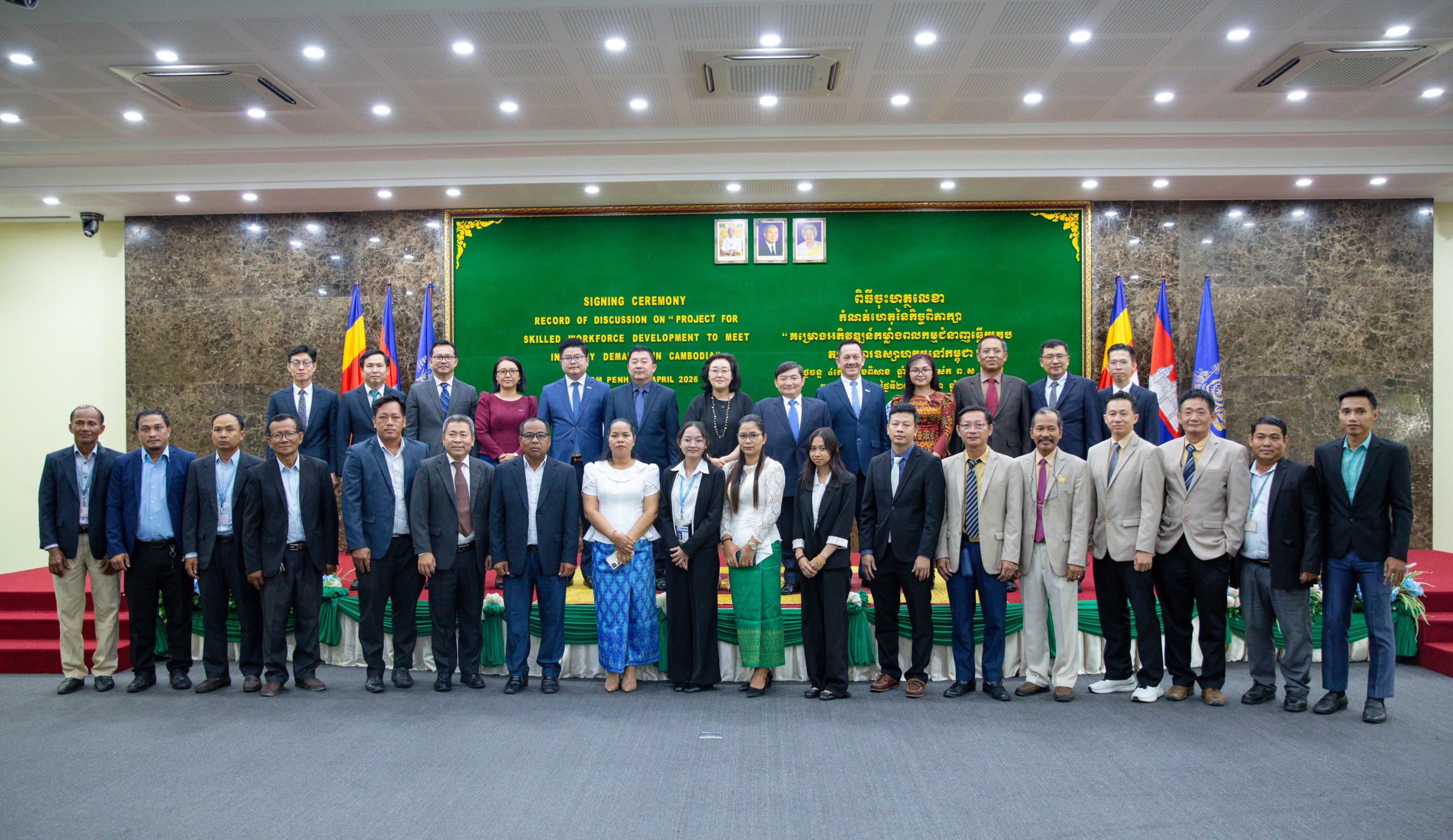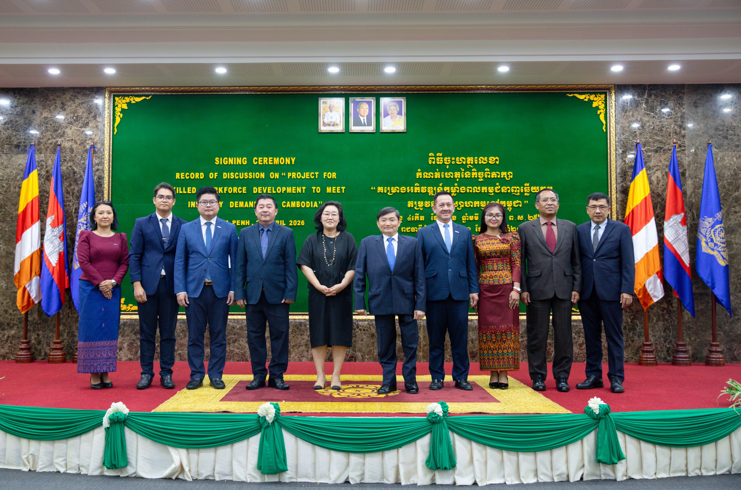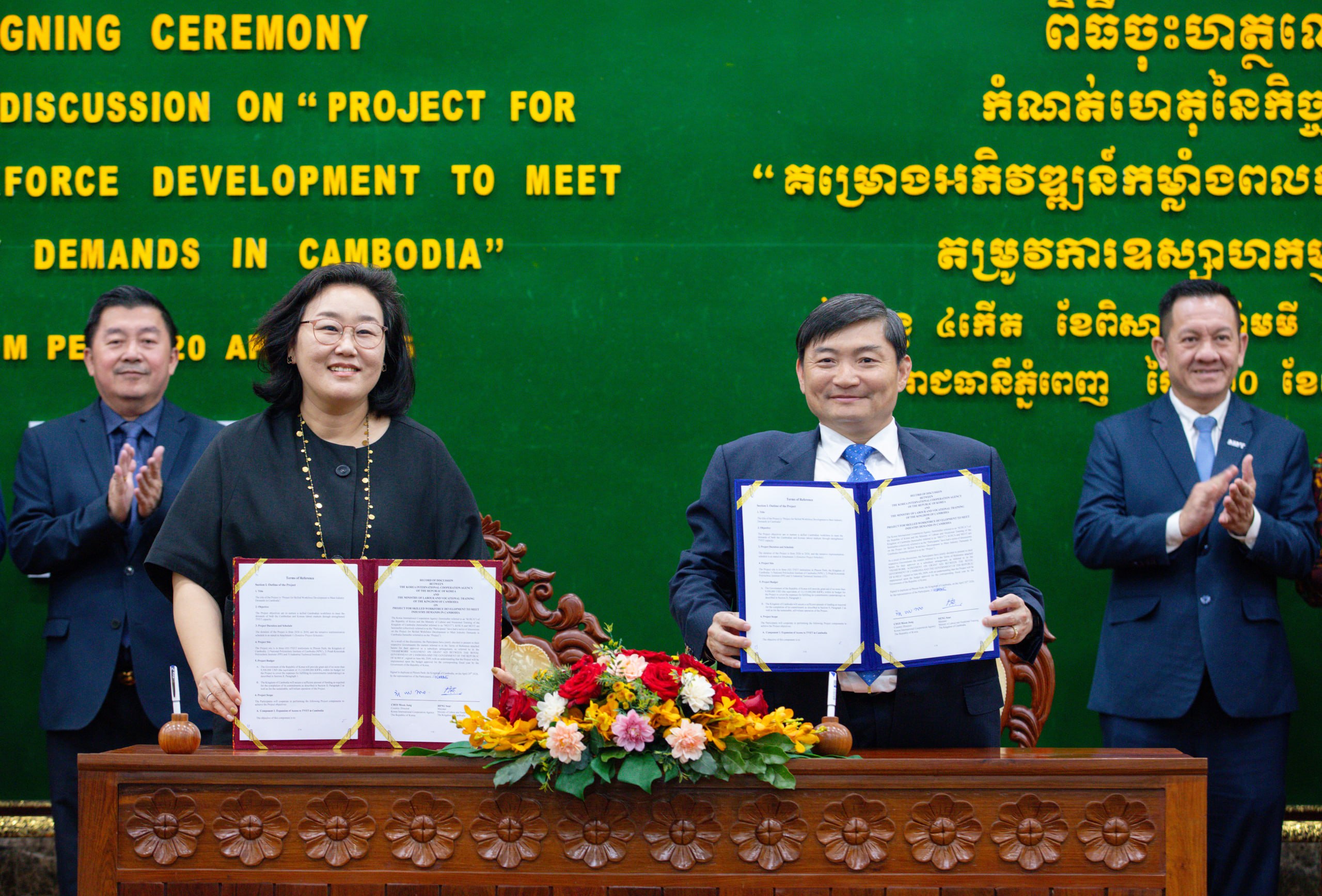 (ភ្នំពេញ)៖ ឯកឧត្ដម ហេង សួរ រដ្ឋមន្ត្រីក្រសួងការងារ និងបណ្ដុះបណ្ដាលវិជ្ជាជីវៈ និងលោកស្រី ឆយ ម៉ូន ជុង (CHOI Moon Jung) នាយិកាទីភ្នាក់ងារសហប្រតិបត្តិការអន្តរជាតិកូរ៉េ (KOICA) ប្រចាំកម្ពុជាបានចុះហត្ថលេខាលើកំណត់ហេតុនៃកិច្ចពិភាក្សាស្តីពី “គម្រោងអភិវឌ្ឍកម្លាំងពលកម្មជំនាញ ដើម្បីឆ្លើយតបតម្រូវការឧស្សាហកម្មនៅកម្ពុជា” នារសៀលថ្ងៃទី២០ ខែមេសា ឆ្នាំ២០២៦ នៅទីស្តីការក្រសួង ក្នុងគោលដៅបណ្តុះបណ្តាលកម្លាំងពលកម្មនៅកម្ពុជាឱ្យកាន់តែមានជំនាញ ដើម្បីបំពេញតម្រូវការទីផ្សារការងារទាំងនៅកម្ពុជា និងសាធារណរដ្ឋកូរ៉េ តាមរយៈការពង្រឹងសមត្ថភាពប្រព័ន្ធ TVET នៅវិទ្យាស្ថាន TVET ចំនួន ៣ គឺ វិទ្យាស្ថានជាតិពហុបច្ចេកទេសកម្ពុជា (NPIC) វិទ្យាស្ថានពហុបច្ចេកទេសព្រះកុសុមៈ (PPI) និងវិទ្យាស្ថានបច្ចេកទេសឧស្សាហកម្ម (ITI)។