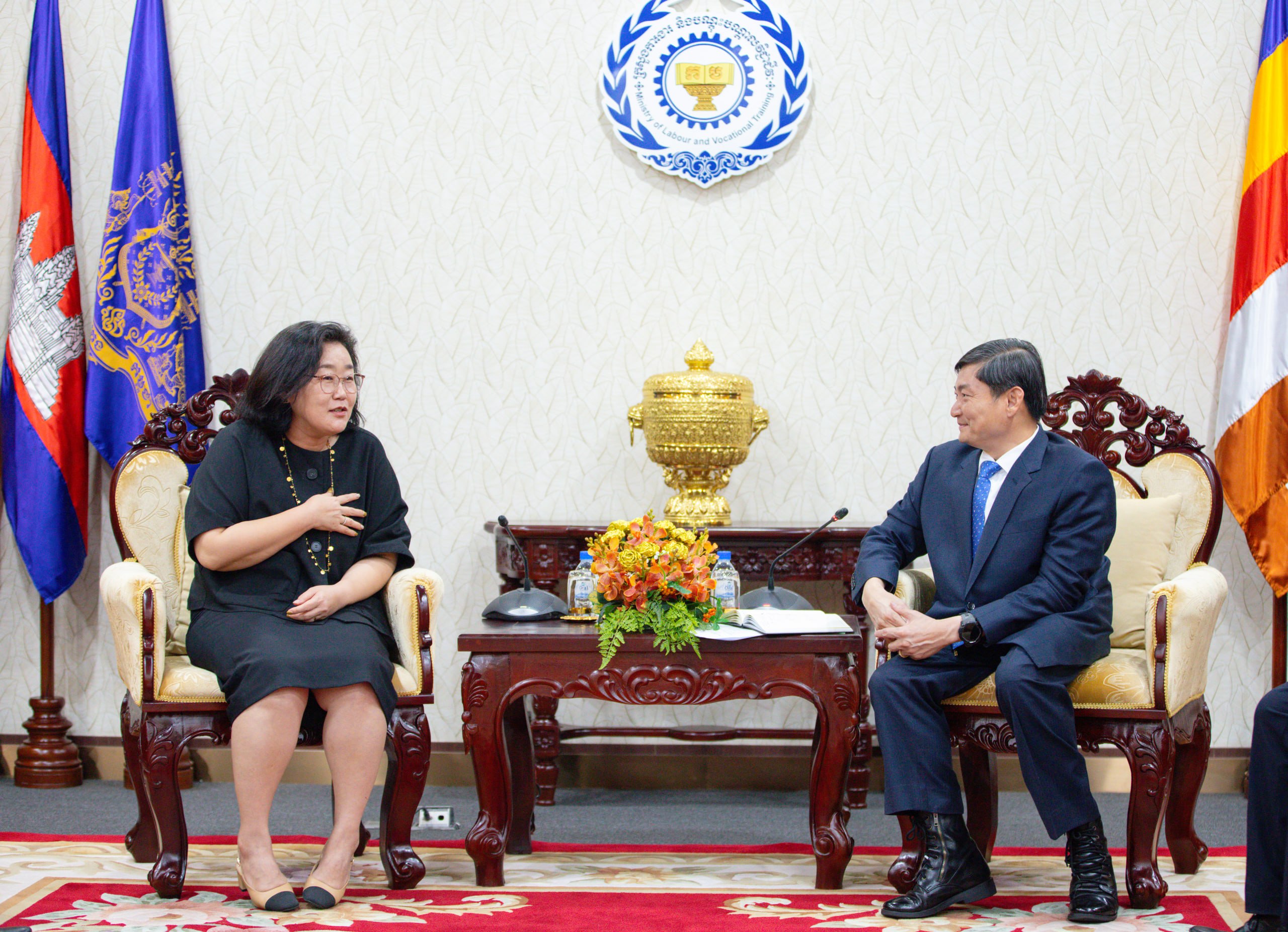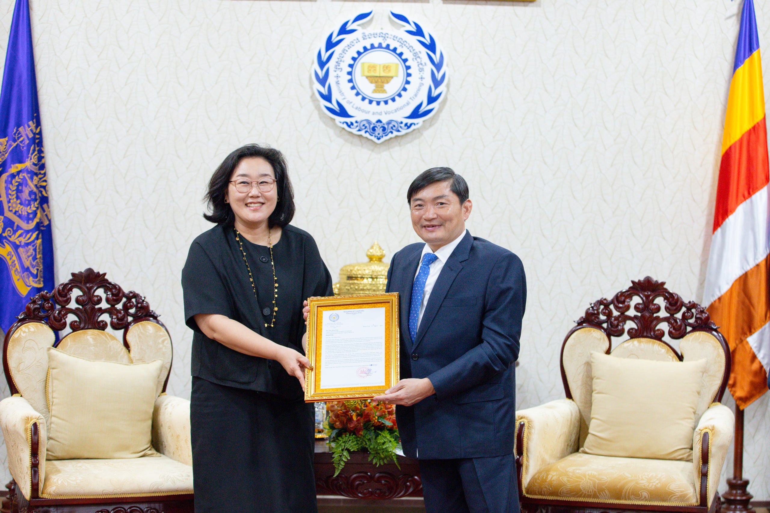 ជាមួយនឹងការថ្លែងអំណរគុណយ៉ាងជ្រាលជ្រៅចំពោះ លោកស្រី ឆយ ម៉ូន ជុង ឯកឧត្ដមរដ្ឋមន្រ្តីបានសម្តែងនូវការជឿជាក់យ៉ាងមុតមាំថា តាមរយៈកិច្ចសហប្រតិបត្តិការនេះ កម្ពុជានឹងអាចជំរុញការអភិវឌ្ឍមូលធនមនុស្សប្រកបដោយគុណភាពខ្ពស់ស្របតាមស្តង់ដាទីផ្សារការងារទាំងក្នុង និងក្រៅប្រទេស ដែលជាទិសដៅអាទិភាពមួយរបស់រាជរដ្ឋាភិបាល ក៏ដូចជាក្រសួងការងារ និងបណ្តុះបណ្តាលវិជ្ជាជីវៈ។ គម្រោងនេះនឹងផ្តល់អត្ថប្រយោជន៍ដល់សិស្សនិងពលករកម្ពុជា ព្រមទាំងនិយោជកកូរ៉េដែលត្រូវការកម្លាំងពលកម្មដែលមានជំនាញនិងសមត្ថភាពផងដែរ។
