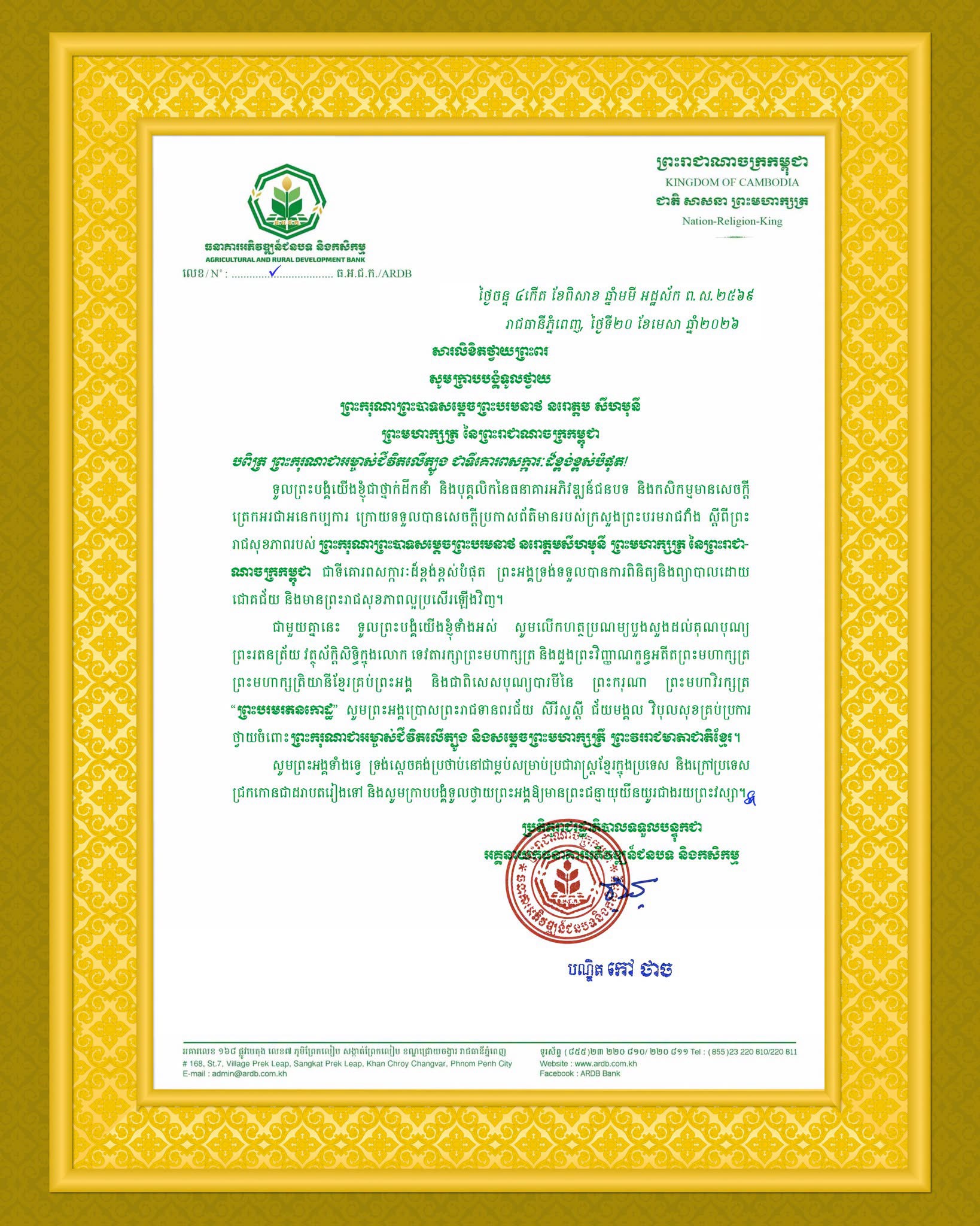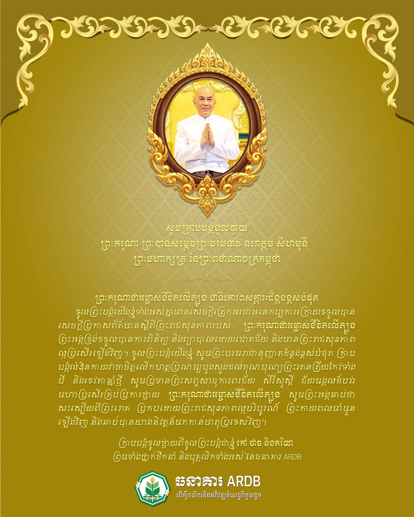 ទូលព្រះបង្គំយើងខ្ញុំជាថ្នាក់ដឹកនាំ និងបុគ្គលិកនៃធនាគារអភិវឌ្ឍន៍ជនបទ និងកសិកម្ម (ARDB) មានសេចក្តីត្រេកអរជាអនេកប្បការក្រោយទទួលបានសេចក្តីប្រកាសព័ត៌មានរបស់ក្រសួងព្រះបរមរាជវាំង ស្តីពីព្រះរាជសុខភាពរបស់ទ្រង់ទទួលបានការពិនិត្យ និងព្យាបាលដោយជោគជ័យ និងមានព្រះរាជសុខភាពល្អប្រសើរឡើងវិញ។