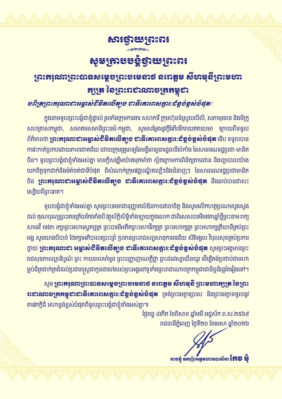 ក្នុងនាមទូលព្រះបង្គំជាខ្ញុំផ្ទាល់ រួមទាំងក្រុមការងារ សហការី ក្រុមហ៊ុននំស្រួយលីលី, សភាមុខរបរ និងមីក្រូសហគ្រាសកម្ពុជា, សមាគមសមាធិព្រះធម៌-កម្ពុជា, សូមសម្តែងនូវក្តីរំភើពរីករាយឥតឧបមា ក្រោយពីទទួលព័ត៌មានថា ព្រះករុណាជាអម្ចាស់ជីវិតលើត្បូង ជាទីគោរពសក្ការៈដ៏ខ្ពង់ខ្ពស់បំផុត ទើប ទទួលបានការវះកាត់ប្រកបដោយភាពជោគជ័យ ដោយក្រុមគ្រូពេទ្យនៃមន្ទីពេទ្យនារដ្ឋធានីប៉េកាំង នៃសាធារណរដ្ឋប្រជា-មានិតចិន។ ទូលព្រះបង្គំជាខ្ញុំទាំងអស់គ្នា មានក្តីសង្ឃឹមយ៉ាងមុតមាំថា ស្ថិតក្រោមការពិនិត្យតាមដាន និងព្យាបាលយ៉ាង យកចិត្តទុកដាក់និងម៉ត់ចត់ជាទីបំផុត ពីសំណាក់ក្រុមវេជ្ជបណ្ឌិតល្បីៗនិងជំនាញៗ នៃសាធារណរដ្ឋប្រជាមានិតចិន ព្រះករុណាជាអម្ចាស់ជីវិតលើត្បូង ជាទីគោរពសក្ការៈដ៏ខ្ពង់ខ្ពស់បំផុត នឹងឆាប់បានជាសះស្បើយពីព្រះរោគ។