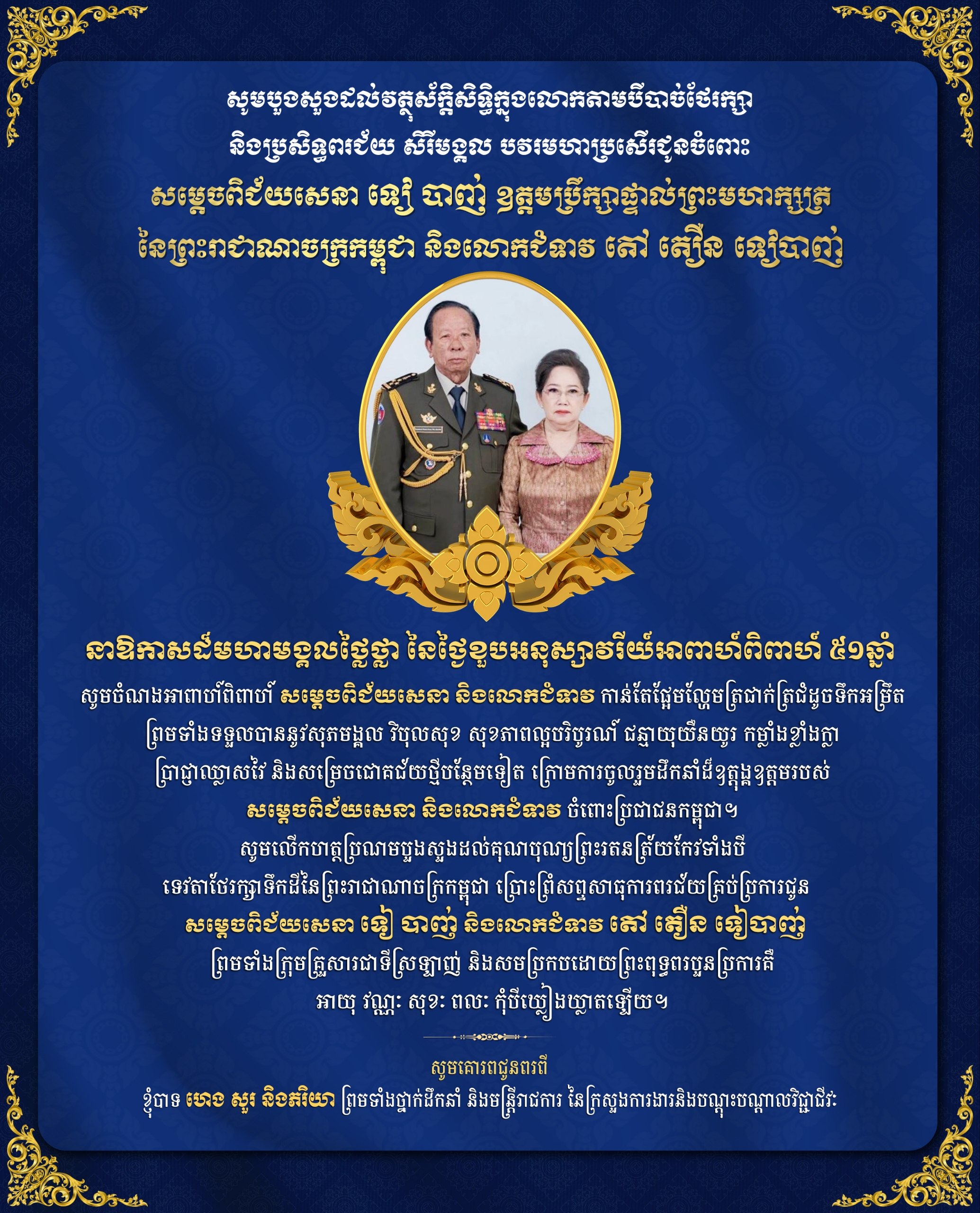 ឯកឧត្តម ហេង សួរ និងលោកជំទាវ ព្រមទាំងថ្នាក់ដឹកនាំ និងមន្ត្រីរាជការ សូមប្រសិទ្ធពរជ័យជូនចំពោះ សម្ដេចពិជ័យសេនា​ ទៀ បាញ់ ឧត្តមប្រឹក្សាផ្ទាល់ព្រះមហាក្សត្រ និងលោកជំទាវ​ តៅ តឿន​ ទៀបាញ់ ក្នុងឱកាសខួបអាពាហ៍ពិពាហ៍ ៥១ឆ្នាំ
