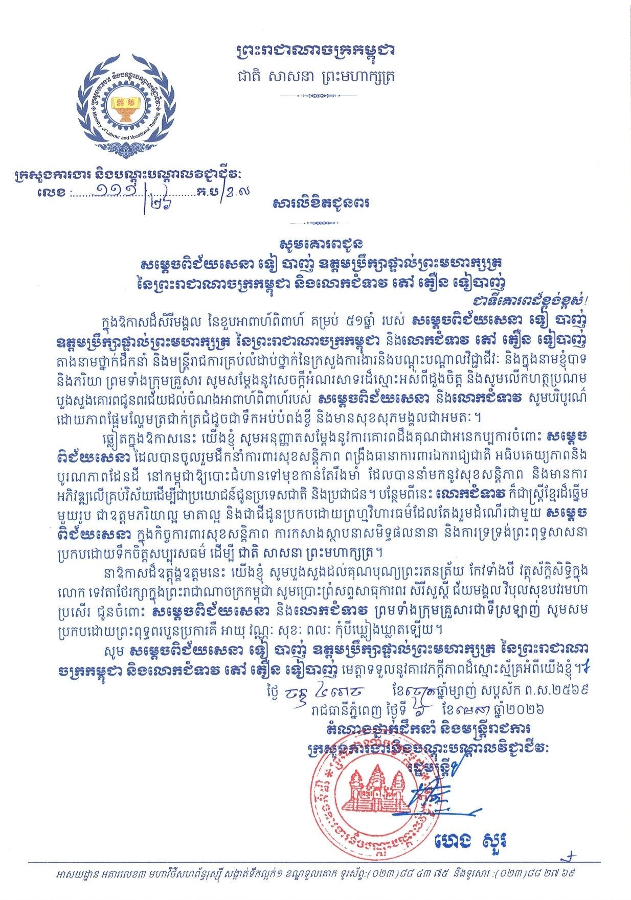 ភ្នំពេញ:ឯកឧត្តម ហេង សួរ និងលោកជំទាវ ព្រមទាំងថ្នាក់ដឹកនាំ និងមន្ត្រីរាជការនៃក្រសួងការងារ និងបណ្ដុះបណ្ដាលវិជ្ជាជីវៈ សូមប្រសិទ្ធពរជ័យជូនចំពោះ សម្ដេចពិជ័យសេនា​ ទៀ បាញ់ ឧត្តមប្រឹក្សាផ្ទាល់ព្រះមហាក្សត្រ នៃព្រះរាជាណាចក្រកម្ពុជា និងលោកជំទាវ​ តៅ តឿន​ ទៀបាញ់ ក្នុងឱកាសខួបអាពាហ៍ពិពាហ៍ ៥១ឆ្នាំ (២៤ មេសា ១៩៧៥ − ២៤ មេសា ២០២៦)។