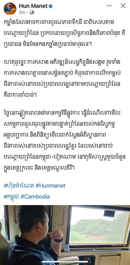 សម្តេចធិបតី ហ៊ុន ម៉ាណែត បានលើកឡើងថា «កម្លាំងដែលអាចការពារបូរណភាពទឹកដី ជាពិសេសតាមបណ្តោយព្រំដែន ប្រកបដោយប្រសិទ្ធភាពនិងចីរភាពយូរអង្វែងបំផុត គឺប្រជាជន មិនមែនកងកម្លាំងប្រដាប់អាវុធទេ។ ហេតុដូច្នេះ ការកសាង អភិវឌ្ឍន៍សេដ្ឋកិច្ចនិងសង្គម រួមទាំងការកសាងហេត្ថារចនាសម្ព័នតភ្ជាប់ ក៏ដូចជាការលើកកម្ពស់ជីវភាពរស់នៅរបស់ប្រជាពលរដ្ឋនៅតាមបណ្តោយព្រំដែនគឺជាការចាំបាច់»។