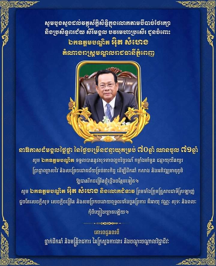 សូមបួងសួងដល់វត្ថុស័ក្តិសិទ្ធិក្នុងលោកតាមបីបាច់ថែរក្សា និងប្រសិទ្ធពរជ័យ សិរីមង្គល បវរមហាប្រសើរ ជូនចំពោះ ឯកឧត្តមបណ្ឌិត អ៊ិត សំហេង តំណាងរាស្ត្រមណ្ឌលរាជធានីភ្នំពេញ ទទួលបាននូវសុភាពល្អបរិបូរណ៍ កម្លាំងមាំមួន ជន្មាយុយឺនយូរ ប្រាជ្ញាឈ្លាសវៃ និងសមប្រកបដោយពុទ្ធពរទាំងបួនប្រការ គឺអាយុ វណ្ណៈ សុខៈ និងពលៈ កុំបីឃ្លៀងឃ្លាតឡើយ។