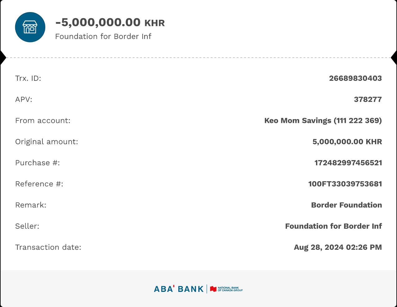 បរិច្ចាគតាមរយៈគណនីធនាគារដូចខាងក្រោម ឈ្មោះគណនី៖ «Foundation for Border Infrastructure Development»
