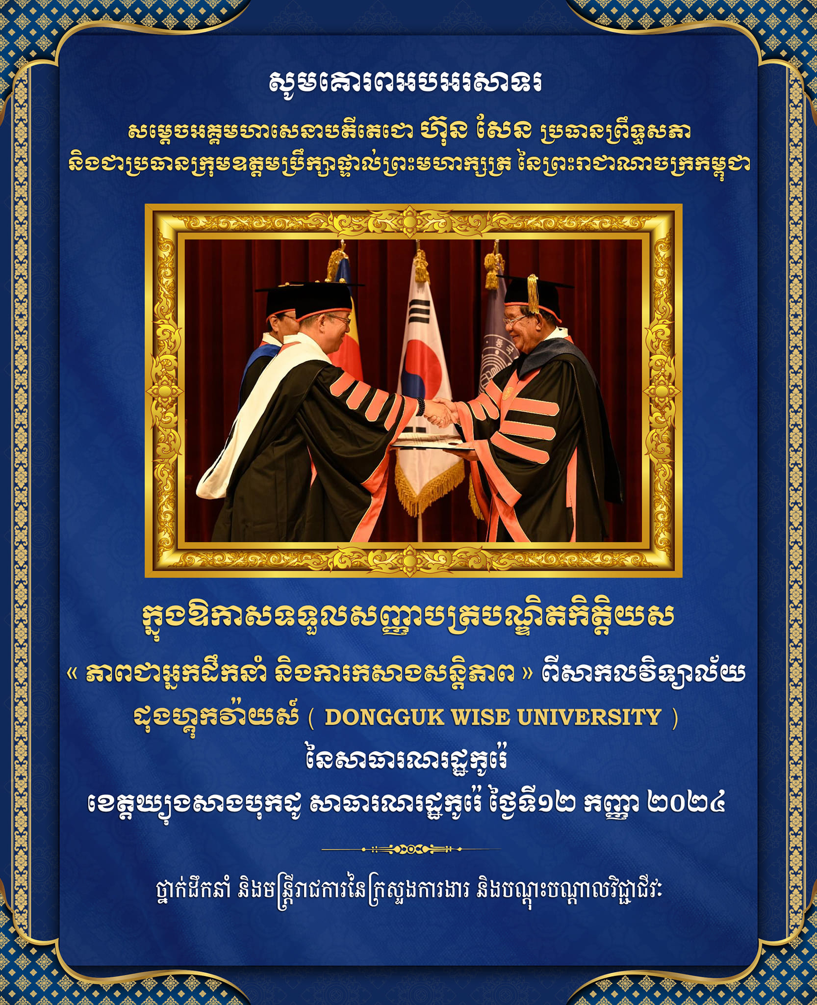 សូមគោរពអបអរសាទរ សម្តេចអគ្គមហាសេនាបតីតេជោ ហ៊ុន សែន ប្រធានព្រឹទ្ធសភា នៃព្រះរាជាណាចក្រកម្ពុជា ក្នុងឱកាសទទួលសញ្ញាបត្របណ្ឌិតកិត្តិយស «ភាពជាអ្នកដឹកនាំ និងការកសាងសន្តិភាព» ពីសាកលវិទ្យាល័យ ដុងហ្គុកវ៉ាយស៍ (Dongguk Wise University) នៃសាធារណរដ្ឋកូរ៉េ