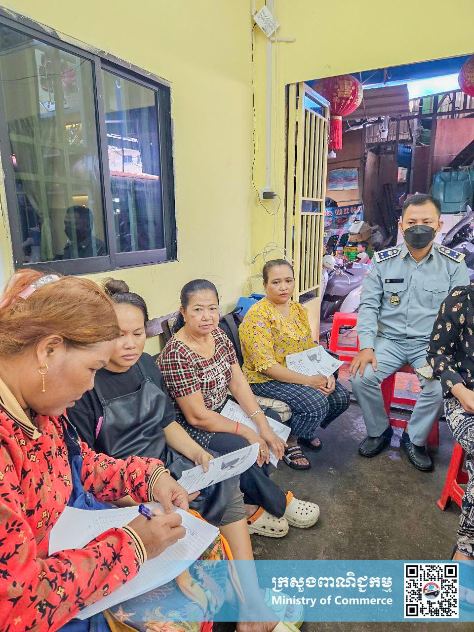 (ភ្នំពេញ)៖ នាព្រឹកថ្ងៃព្រហស្បត្តិ៍ ទី១២ ខែកញ្ញ ឆ្នាំ២០២៤ មន្រ្តីសាខាការពារអ្នកប្រើប្រាស់ កិច្ចការប្រកួតប្រជែង និងបង្ក្រាបការក្លែងបន្លំ (ក.ប.ប.) រាជធានីភ្នំពេញ រួមជាមួយមន្ត្រីជំនាញនៃនាយកដ្ឋានមន្ទីរពិសោធន៍ និងនាយកដ្ឋានបច្ចេកទេស នៃអគ្គនាយកដ្ឋាន ក.ប.ប. សហការជាមួយគណៈកម្មការផ្សារកណ្តាល បានអញ្ជើញអាជីវករ ចំនួន ១៥នាក់ ដែលប្រកបអាជីវកម្ម ស្តុកទុក លក់ និងចែកចាយ ផលិតផលគីមី លក់សាប៊ូ លក់ជ្រក់ លក់ប្រហិត លក់ខ្ញីហាន់ លក់សណ្តែកបណ្តុះ លក់លត នំបាញ់ឌុក គ្រឿងសមុទ្រ សាច់អាំង ជាដើម។ល។ មកចូលរួមស្តាប់នូវបទបង្ហាញពីមន្ត្រីជំនាញ ក.ប.ប. អំពីខ្លឹមសារប្រកាសលេខ១៩២ ព.ណ.អ.កបប ចុះថ្ងៃទី២ ខែកញ្ញា ឆ្នាំ២០២២ ស្តីពីលក្ខខណ្ឌតម្រូវនៃការដាក់ស្លាកសញ្ញាសម្រាប់ផលិតផលគីមីប្រើប្រាស់តាមគេហដ្ឋាន របស់ក្រសួងពាណិជ្ជកម្ម និងគោលការណ៍ណែនាំស្តីពីសុវត្ថិភាពម្ហូបអាហារនៅតាមអាហារដ្ឋាន ចល័តឬស្តង់លក់អាហារ។