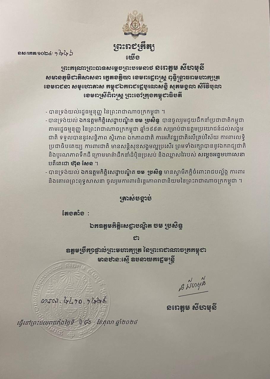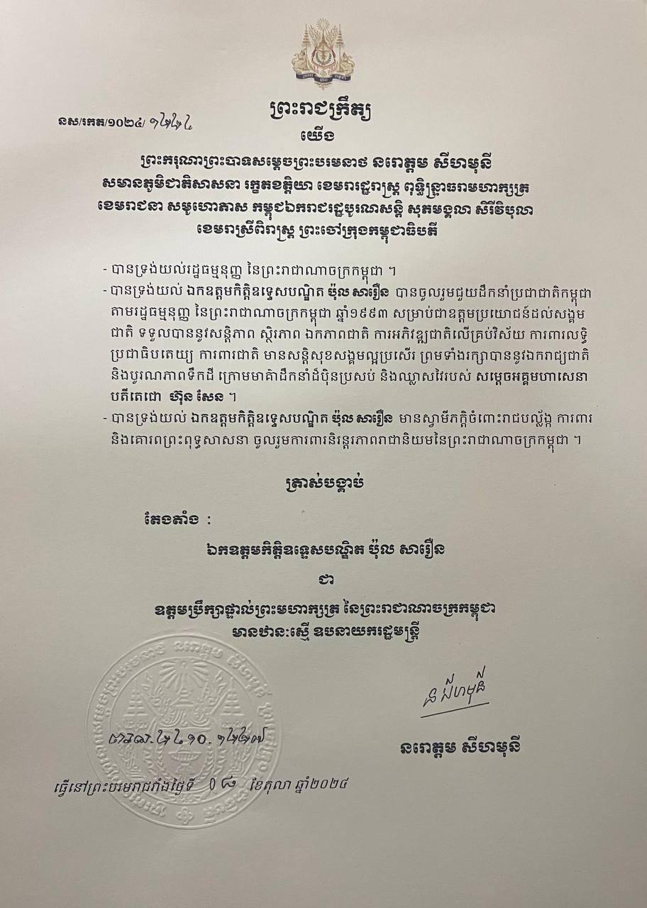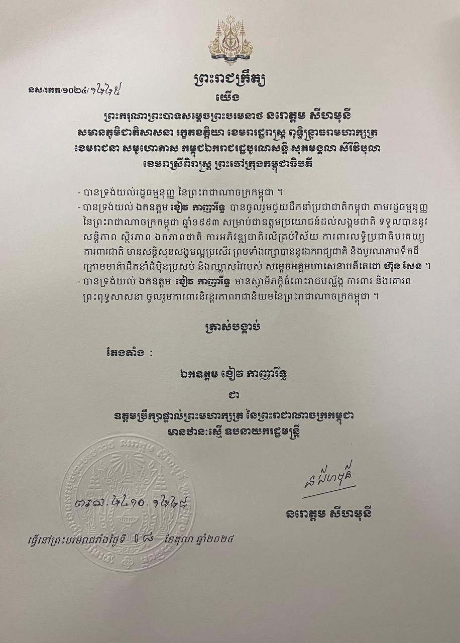 ព្រះមហាក្សត្រ ចេញព្រះរាជក្រឹត្យត្រាស់បង្គាប់តែងតាំងឯកឧត្តម ខៀវ កាញារីទ្ធឯកឧត្តមកិត្តិសេដ្ឋាបណ្ឌិត ចម ប្រសិទ្ធ និងឯកឧត្តមកិត្តិឧទ្ទេសបណ្ឌិត ប៉ុល សារឿន ជា «ឧត្តមប្រឹក្សាផ្ទាល់ព្រះមហាក្សត្រ» ឋានៈស្មើ ឧបនាយករដ្ឋមន្រ្តី