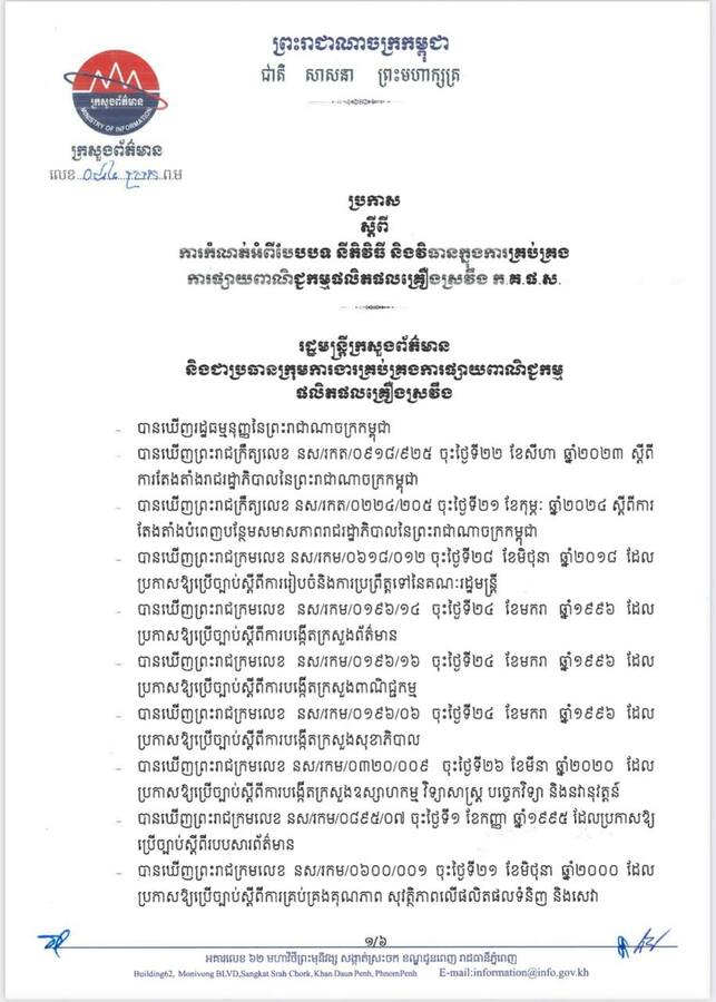 នៅក្នុងសិក្ខាសាលាមួយនៅព្រឹកថ្ងៃទី១០ ខែតុលា ឆ្នាំ២០២៤នេះនៅសណ្ឋាគារ សុខាភ្នំពេញ លោក ហួត ឃាងវេង រដ្ឋលេខាធិការក្រសួងព័ត៌មាន និងជាប្រធានលេខាធិការដ្ឋាន ក្រុមការងារអន្តរក្រសួងគ្រប់គ្រងការផ្សាយពាណិជ្ជកម្មផលិតផលគ្រឿងស្រវឹងបានឡើងបង្ហាញអំពីបែបបទ នីតិវិធី និងវិធានក្នុងការគ្រប់គ្រងការផ្សាយពាណិជ្ជកម្មផលិតផលគ្រឿងស្រវឹង ដែលរាល់ការផ្សាយពាណិជ្ជកម្មផលិតផលគ្រឿងស្រវឹង ត្រូវគោរពតាមគោលការណ៍ ចំនួន១៧ ដែលសម្រេចកាលពីថ្ងៃទី២៣កក្កដាឆ្នាំ២០២៤។