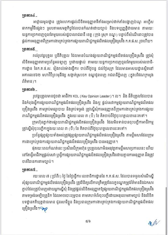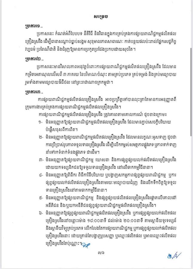 យោងតាមខ្លឹមសារបែបបទ នីតិវិធី និងវិធានក្នុងការគ្រប់គ្រង ការផ្សាយពាណិជ្ជកម្មផលិតផលគ្រឿងស្រវឹងនេះបានចែងថា ការផ្សាយពាណិជ្ជកម្មផលិតផលគ្រឿងស្រវឹងអាចប្រព្រឹត្តទៅបានលុះត្រាតែមានការអនុញ្ញាតពីក្រុមការងារគ្រប់គ្រងការផ្សាយពាណិជ្ជកម្មផលិតផលគ្រឿងស្រវឹង(ដឹកនាំដោយក្រសួងព័ត៌មាន)។