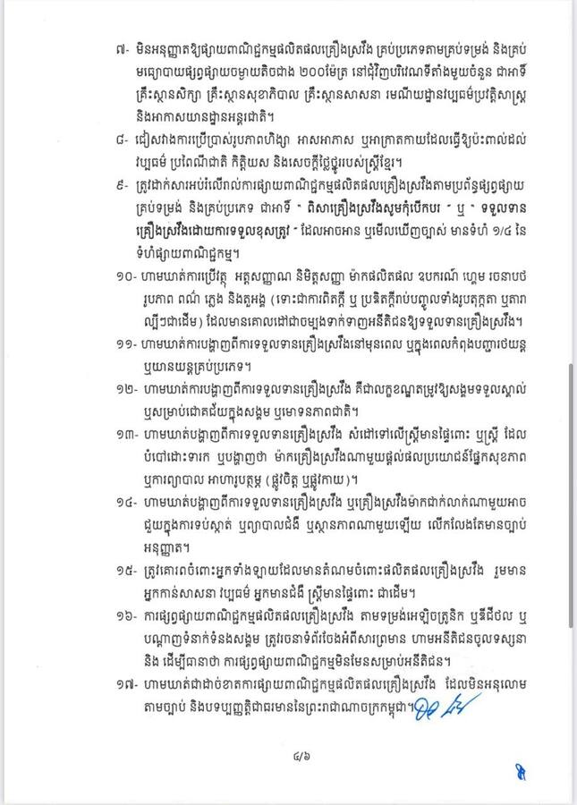 ការផ្សាយពាណិជ្ជកម្មផលិតផលគ្រឿងស្រវឹង ត្រូវគោរពតាមគោលការណ៍ចំនួន១៧ ចំណុច ដូចបានចែងក្នុងប្រកាសរបស់ក្រសួងព័ត៌មាន ស្តីការកំណត់អំពីបែបបទ នីតិវិធី និងវិធានក្នុងការគ្រប់គ្រង ការផ្សាយពាណិជ្ជកម្មផលិតផលគ្រឿងស្រវឹង ក.គ.ផ.ស.» ៕ អត្ថបទ៖ ពេជ ប៊ុនរ៉ា MoINFO APP