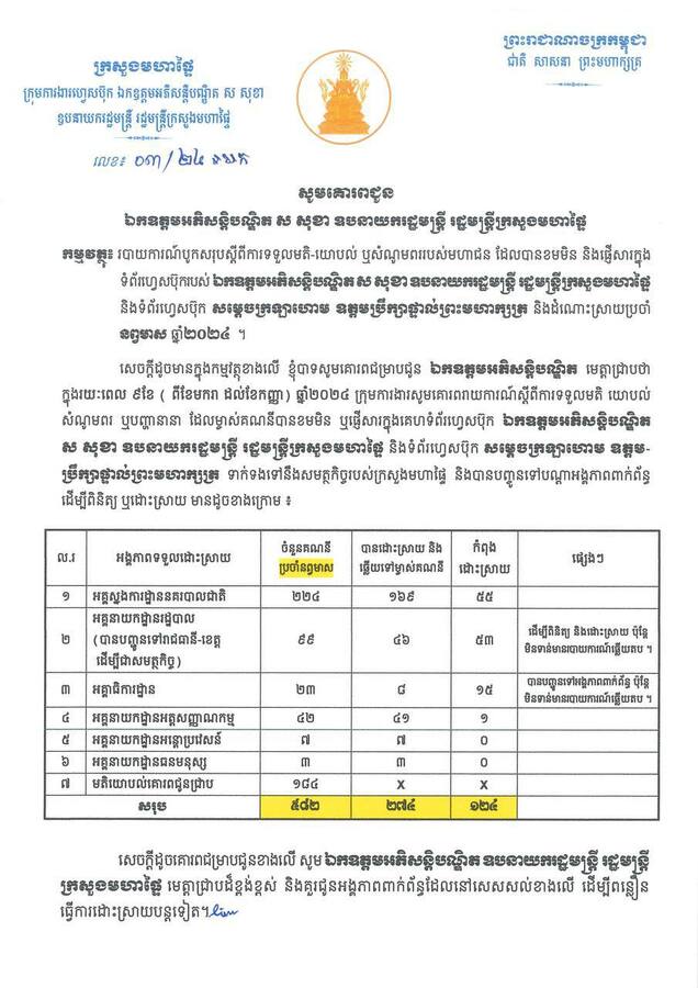 ក្នុងរយៈពេល ៩ខែ នៃឆ្នាំ២០២៤ នេះ ក្រុមការងារតាមដានអំពីការដោះស្រាយចំពោះមតិយោបល់ ឬសំណូមពររបស់បងប្អូនប្រជាពលរដ្ឋ ក្នុងទំព័រហ្វេសប៊ុករបស់ខ្ញុំ និងទំព័រហ្វេសប៊ុកសម្តេចក្រឡាហោម ស ខេង ក្នុងសមត្ថកិច្ចក្រសួងមហាផ្ទៃ បានទទួលសំណូមពរ និងសំណួររបស់ប្រជាពលរដ្ឋ ចំនួន ៥៨២គណនី ដែលក្នុងនោះ មតិយោបល់របស់ប្រជាពលរដ្ឋ ចំនួន ១៨៤គណនី បានលើកឡើងជាធាតុចូល ជូនថ្នាក់ដឹកនាំ និងអង្គភាពជំនាញផ្សេងៗដើម្បីជ្រាប ក៏ដូចជាការកែលំអរក្នុងការងារប្រចាំថ្ងៃក្នុងដែនសមត្ថកិច្ចក្រសួងមហាផ្ទៃ។ ទន្ទឹមនឹងនេះដែរ ក្រុមការងារ ក៏បានទទួលបានការដោះស្រាយ និងបានឆ្លើយតបទៅម្ចាស់គណនី ចំនួន ២៧៤គណនី និង ១២៤គណនីទៀត កំពុងស្ថិតក្នុងដំណាក់កាលដោះស្រាយ។